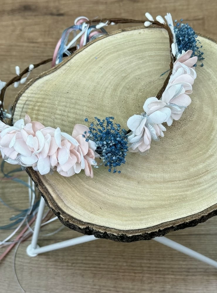 Headband with dried flowers and satin ribbons in three colors. It adapts perfectly using a type of wire, it can be used between 2 and 10 years approx.