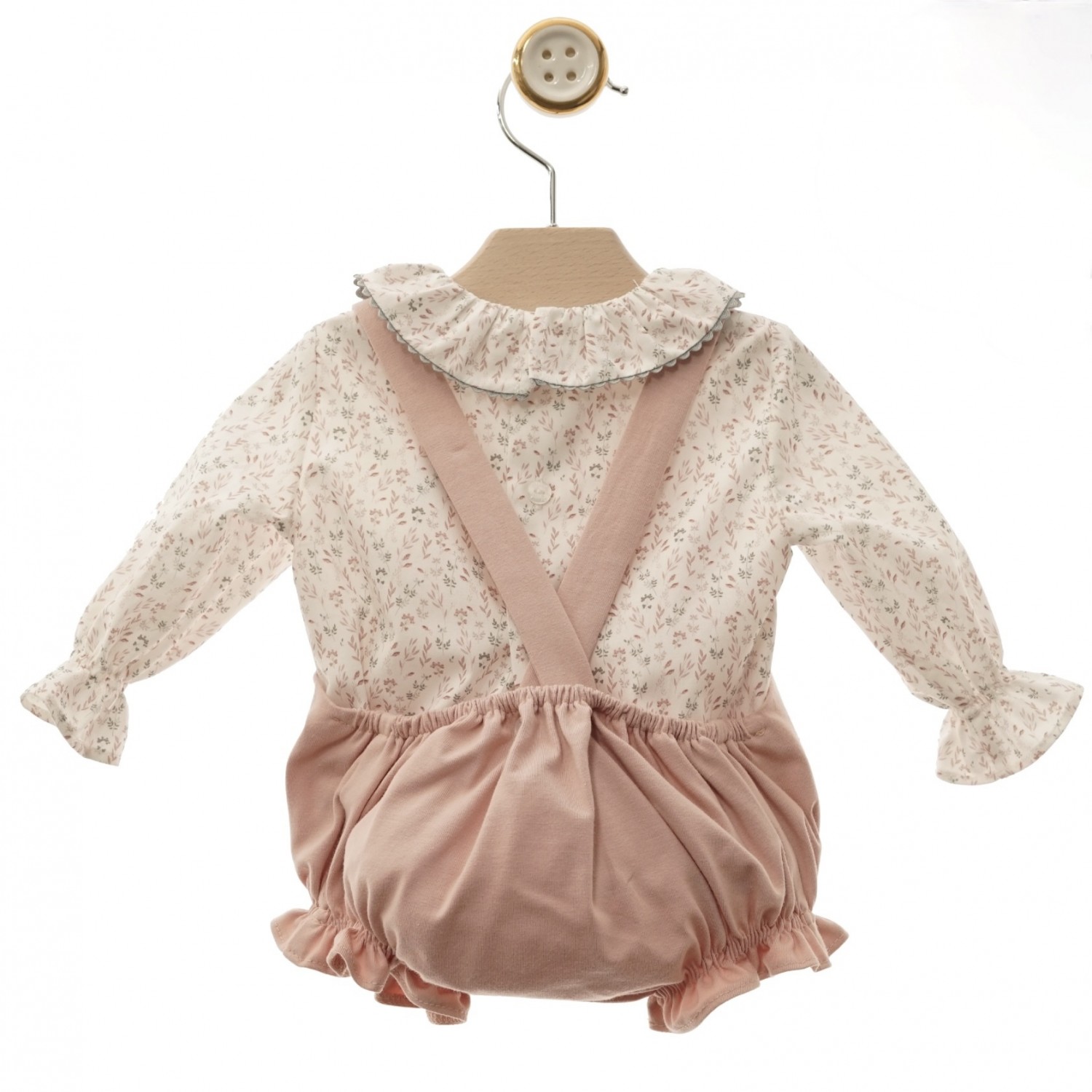Viella blouse on an ecru background with liberty flowers in pink and grey. With a dusty pink cotton frog. It's cool.