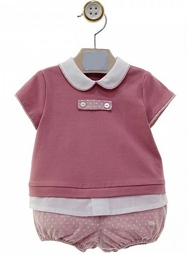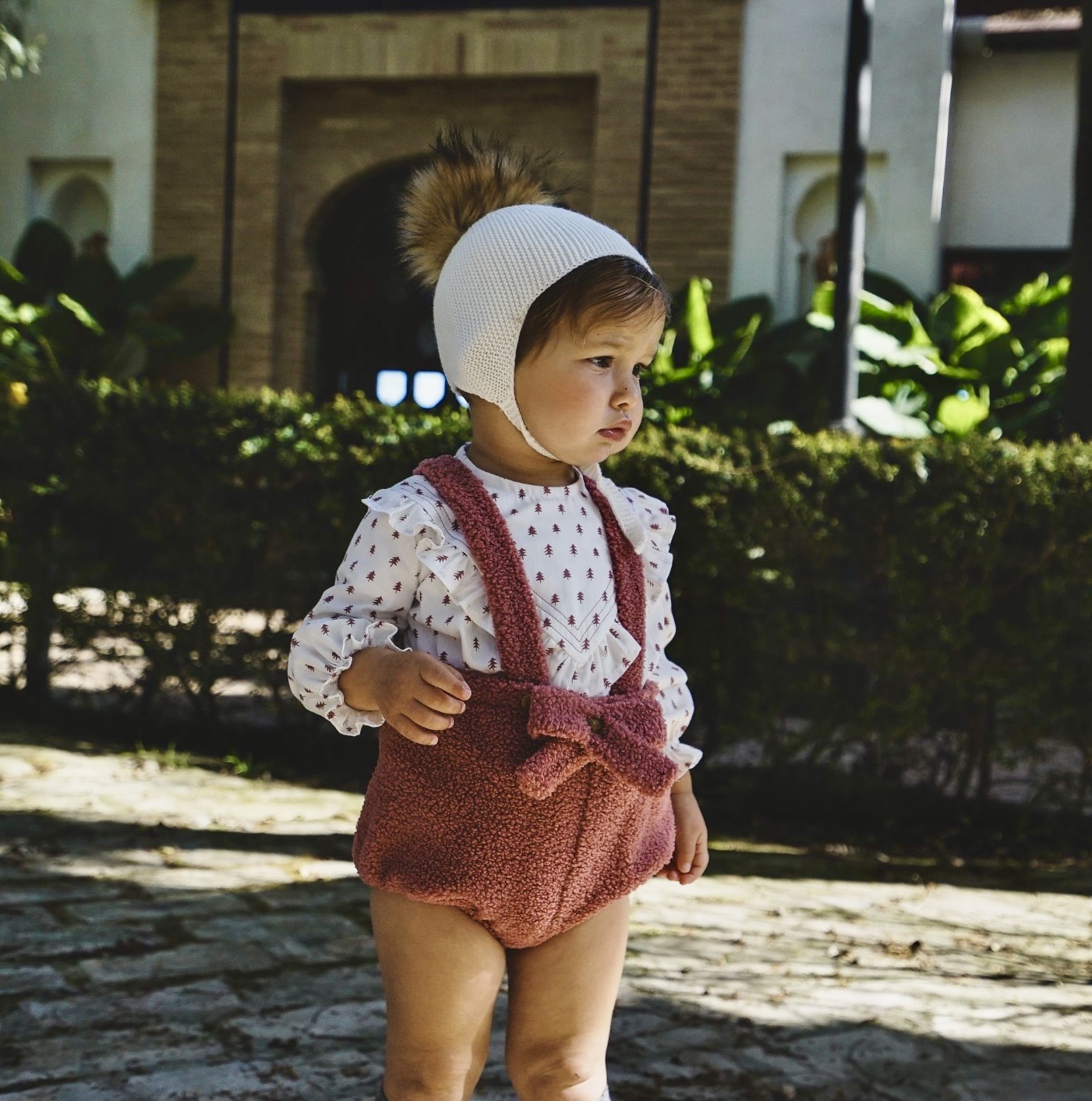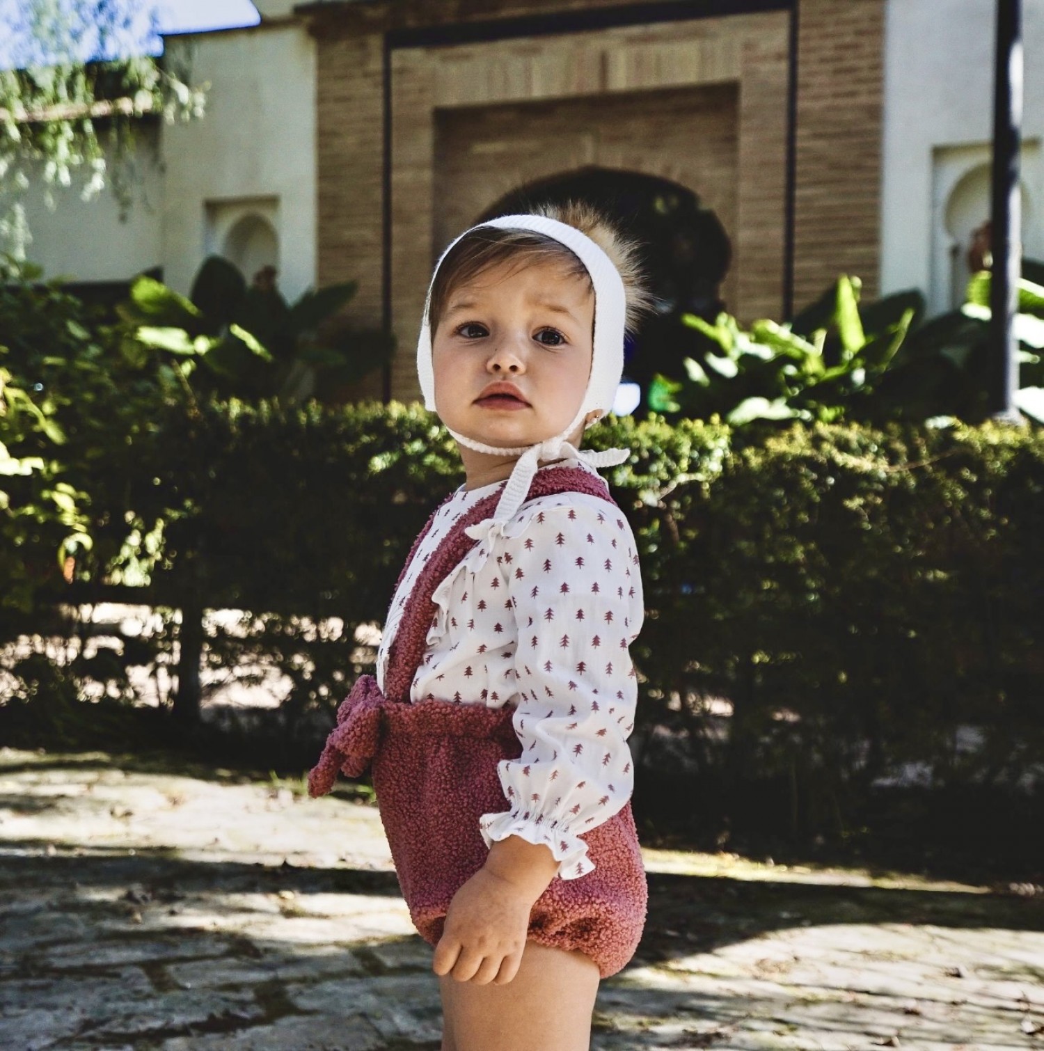 Ecru viella blouse with powder pink pine trees and frog with terrycloth straps also in powder pink. Very comfortable and original.