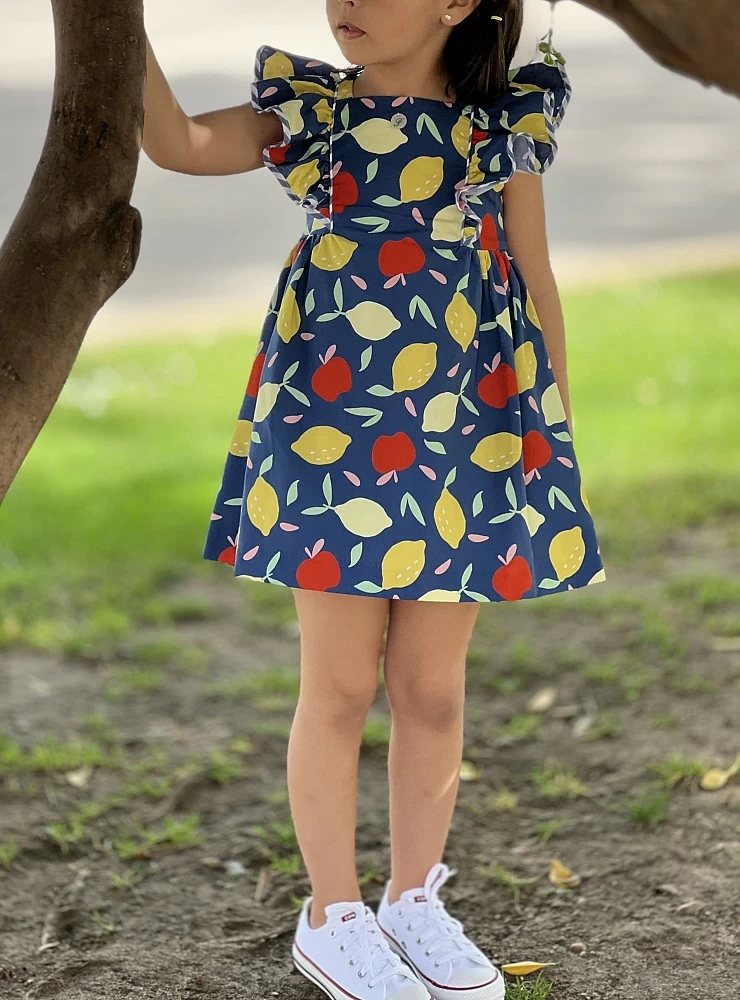 Confeccionado en batista con fondo azulón, lleva estampado frutas con lazo en la espalda de rayas azul y blanco. Una combinación muy divertida
