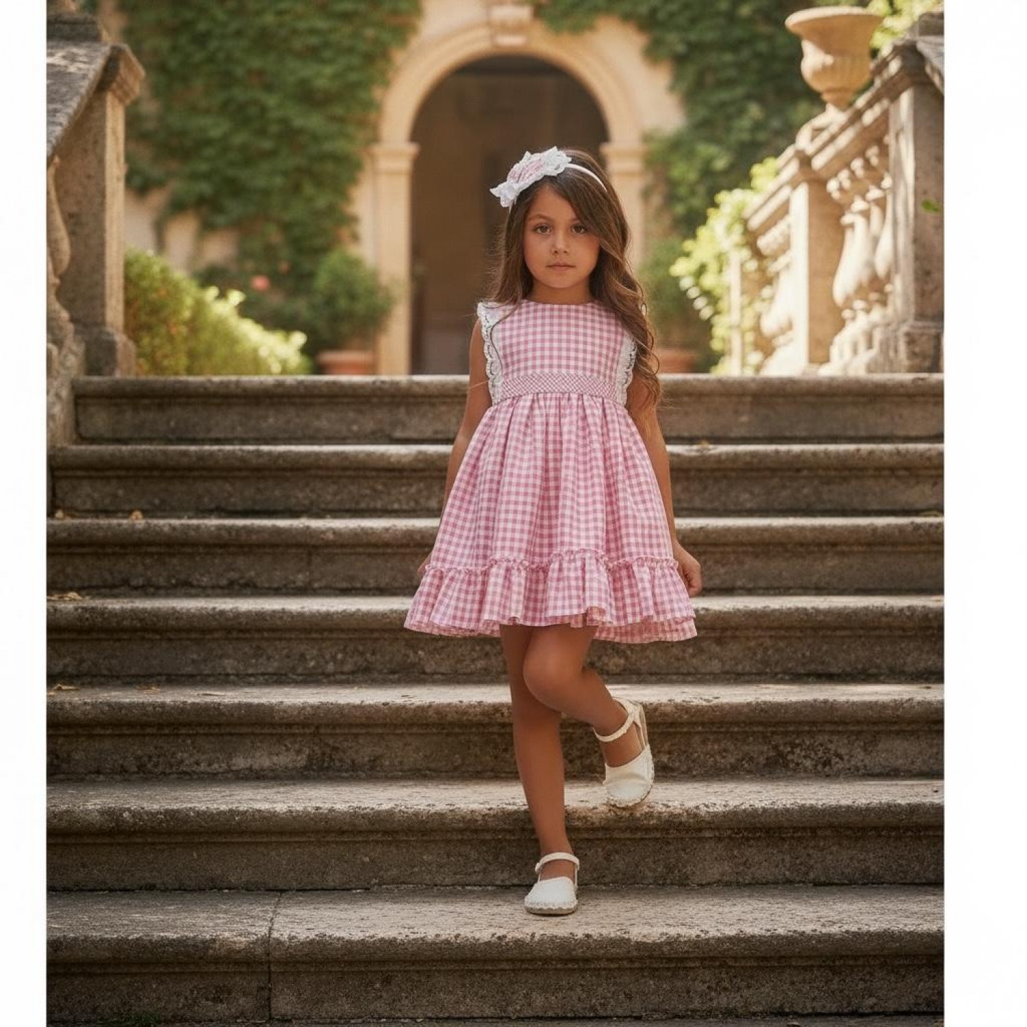 Girls' dress made from pink and white gingham fabric, with a sweet and very flattering design.
