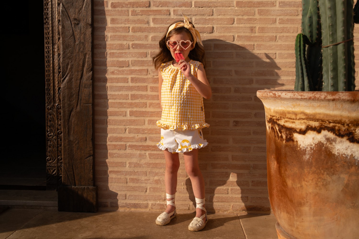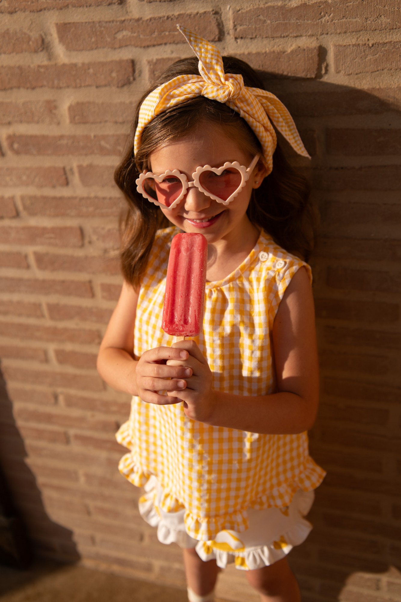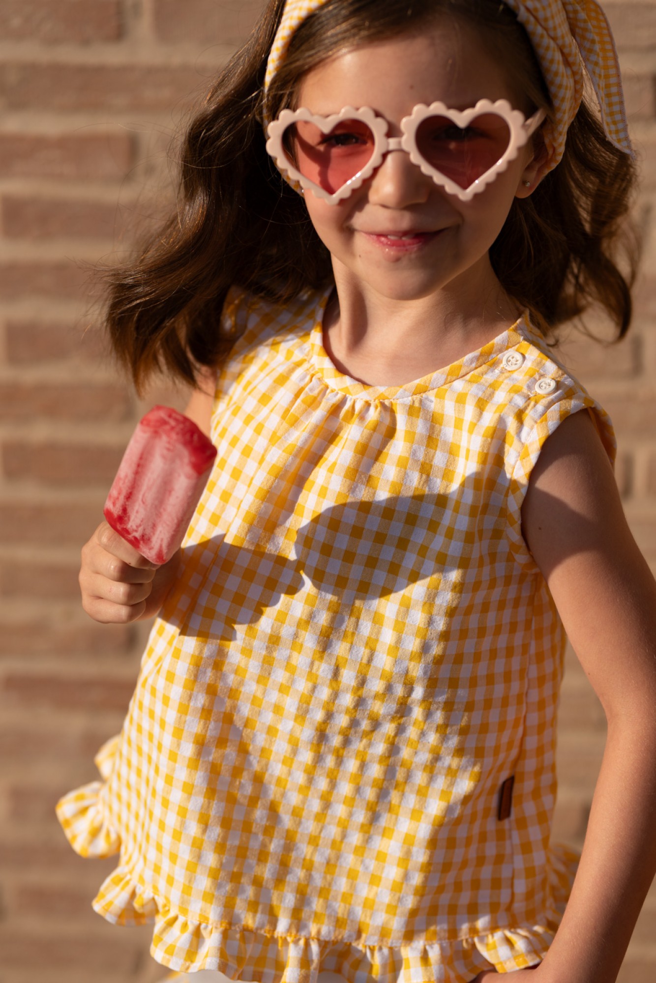 The blouse is made of lightweight cotton with a small gingham print in mustard yellow and white. The yellow is bright and cheerful, perfect for summer, adding a fresh touch to the outfit. It features a slightly gathered round neck and a hem finished with a small ruffle in the same fabric, creating a sweet and polished look.