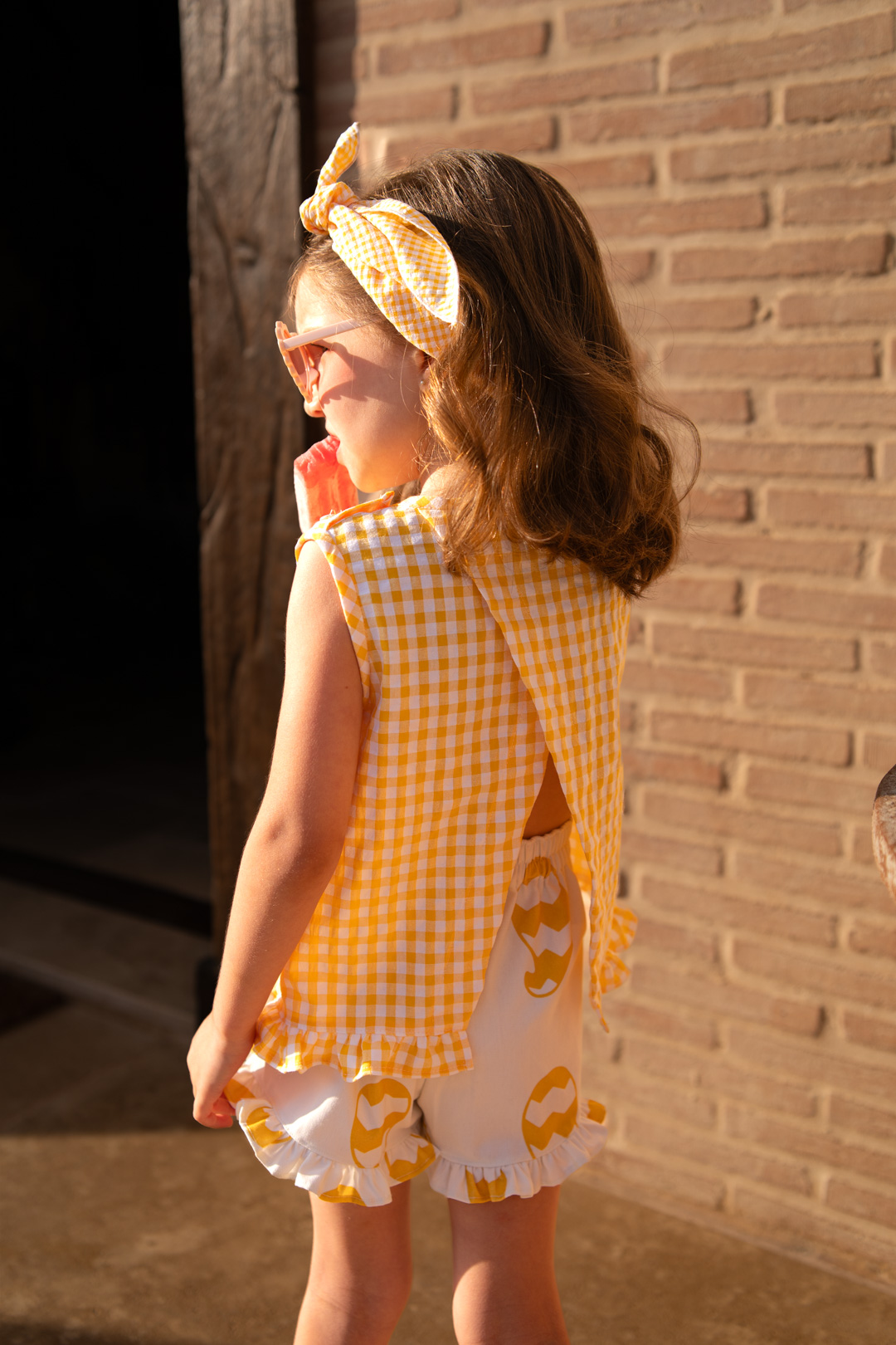 A girls' outfit consisting of a gingham blouse and printed shorts in shades of yellow.