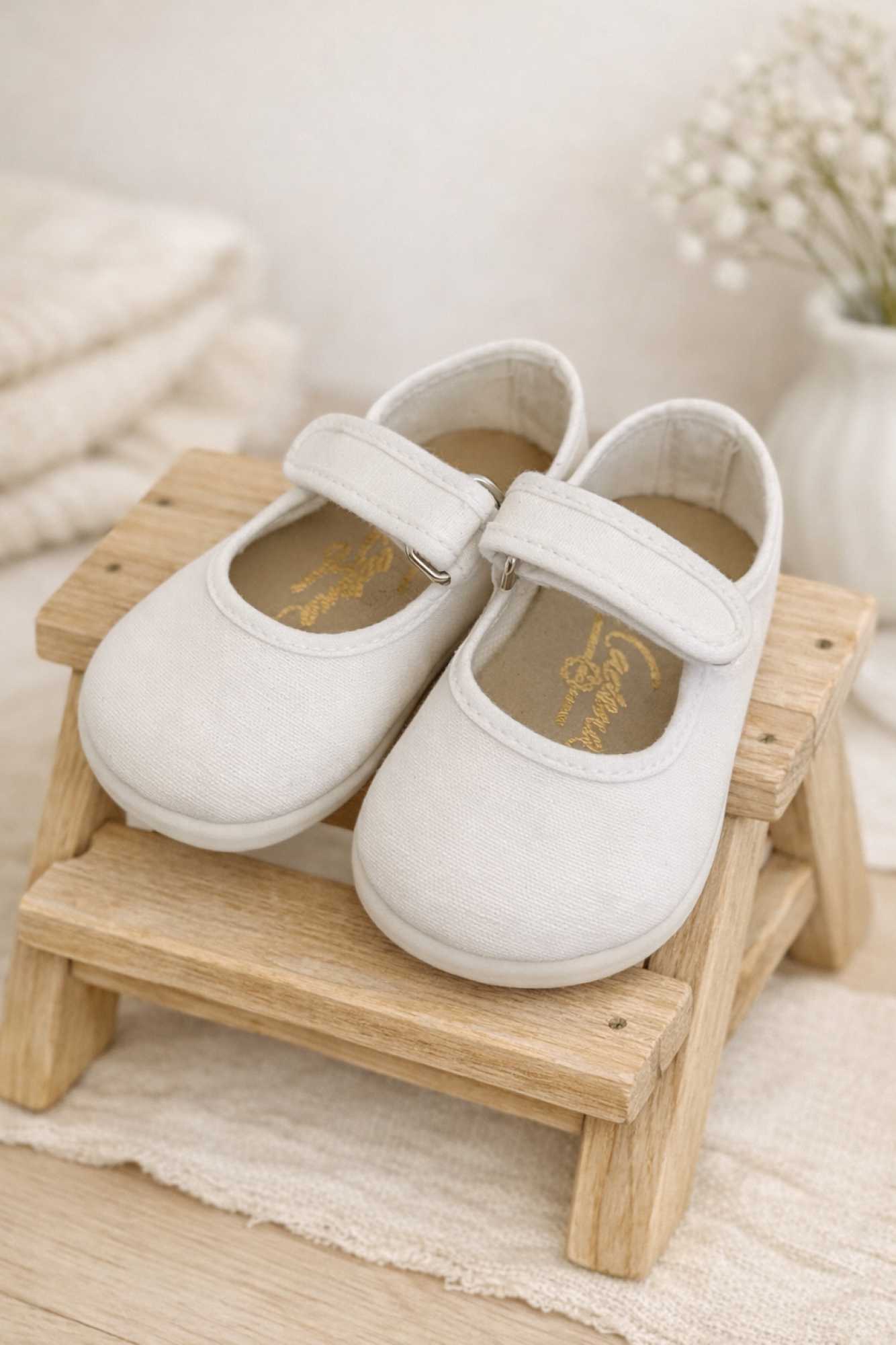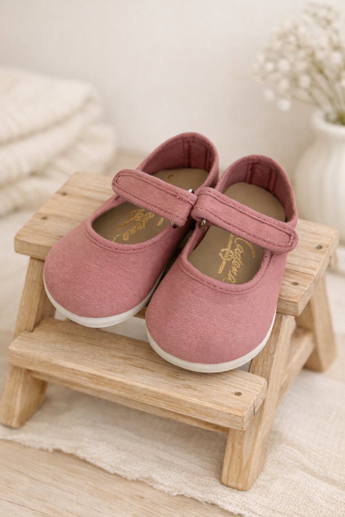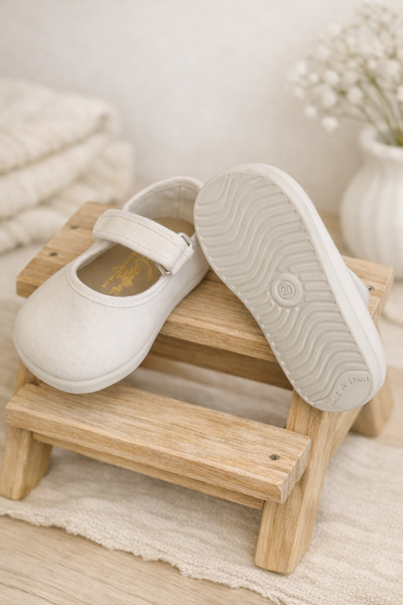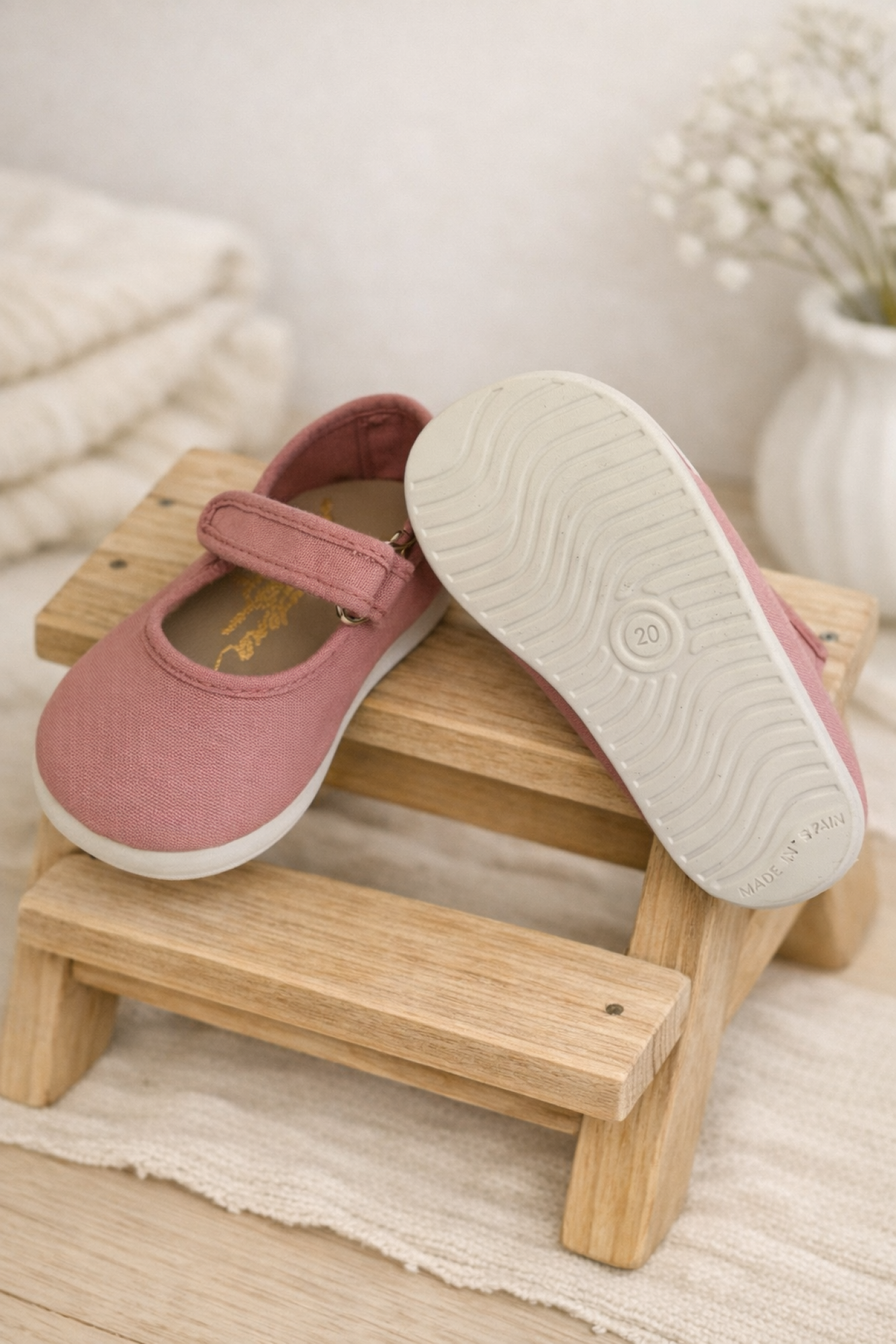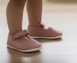 Canvas Mary Janes for girls in pale pink and white, an essential basic for everyday wear and special occasions.