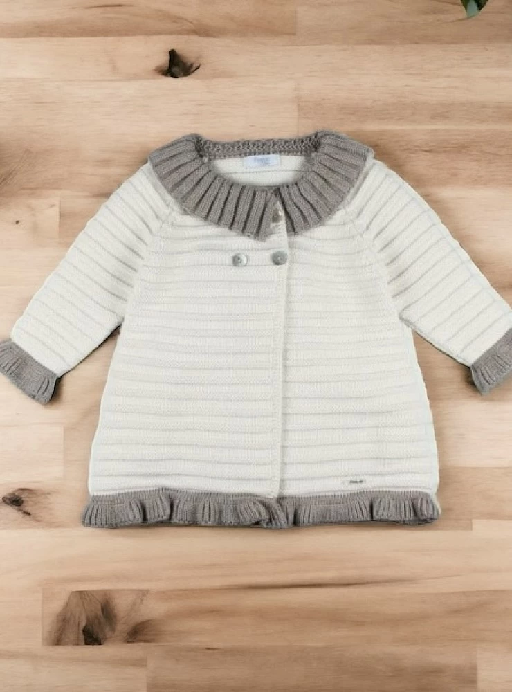 It is made of double links knit in ecru with a flounced collar, cuffs and bottom in stone color.
