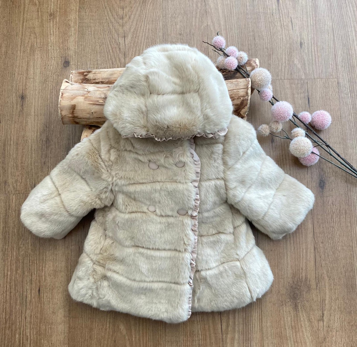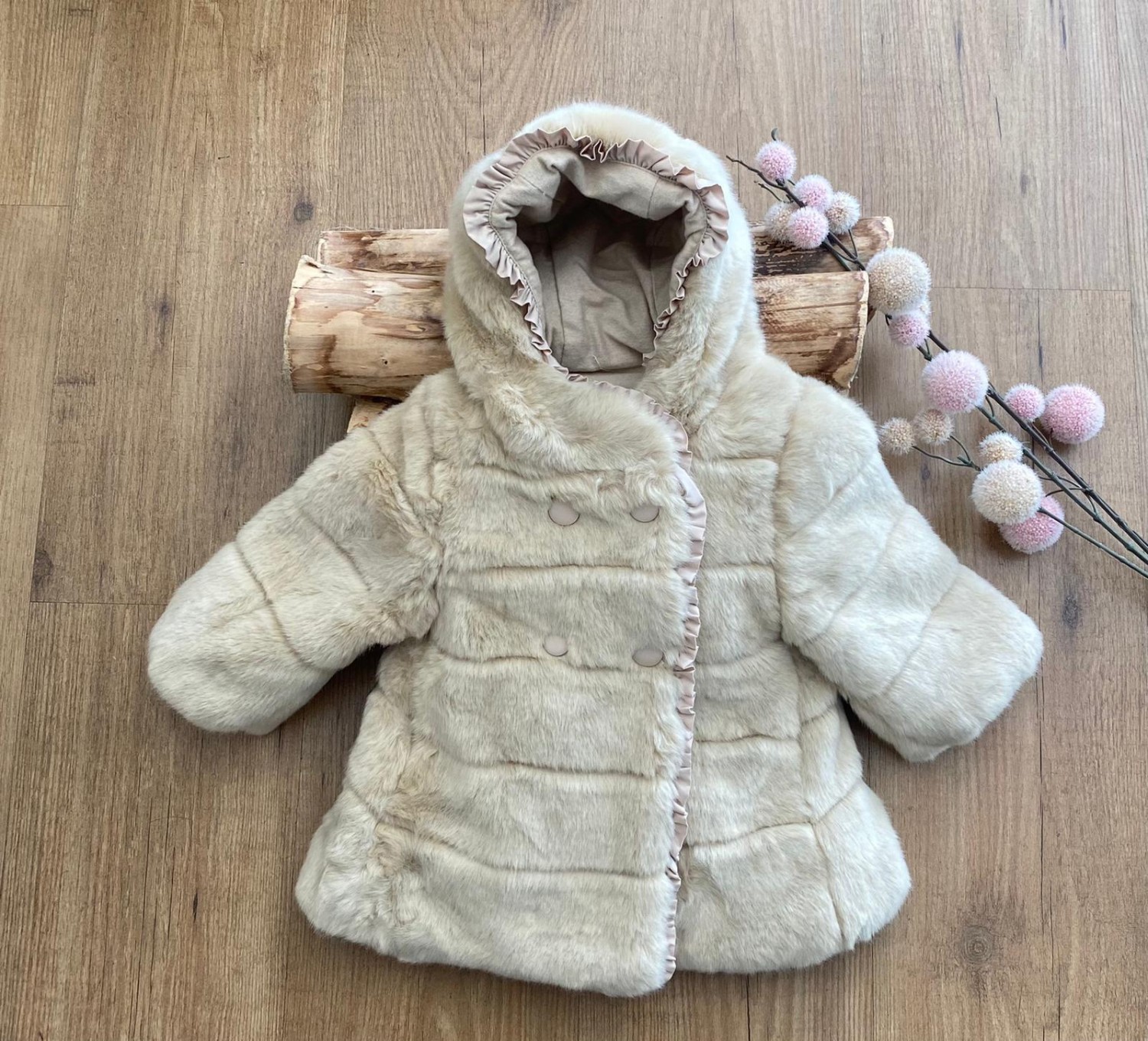 Made of sand-colored hair with a cotton-lined interior. It is very warm. It has a hood and a boal board finish in the same tone.