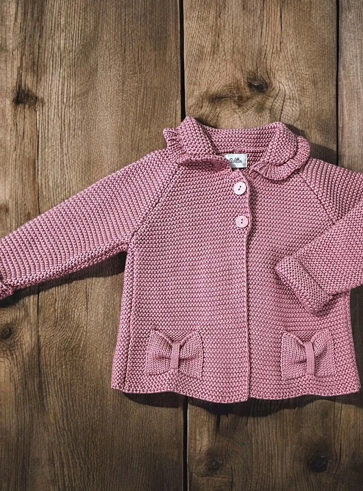 It is approximately hip-length. It has round necks with a ruffle and pockets with a bow. Pleat on the back