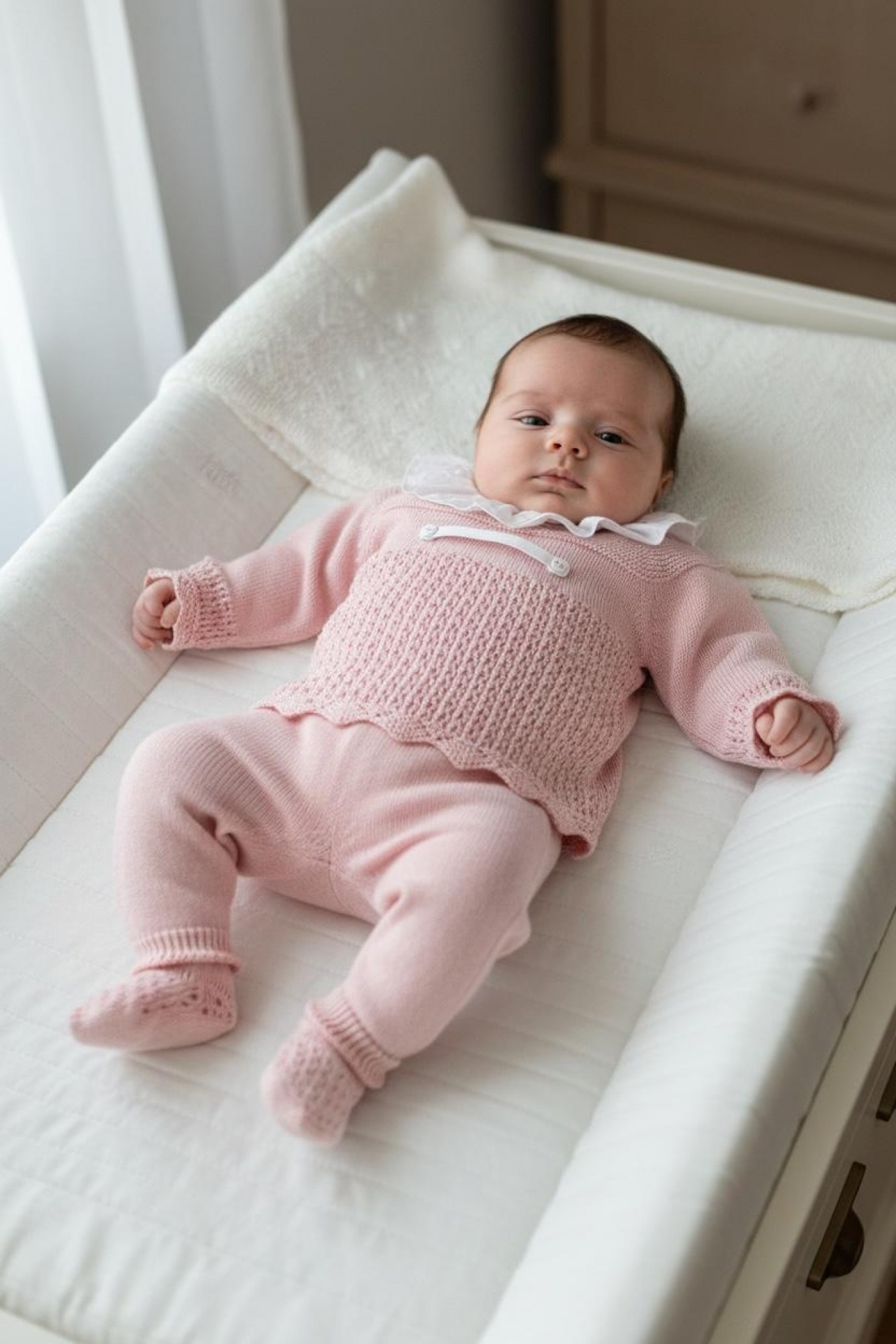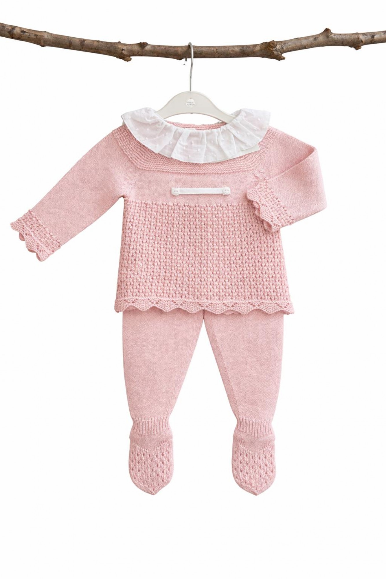 The matching leggings, also in dusty rose knit, have covered feet and openwork details at the bottom, maintaining the overall harmony of the set.