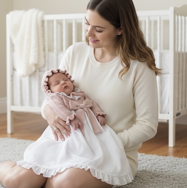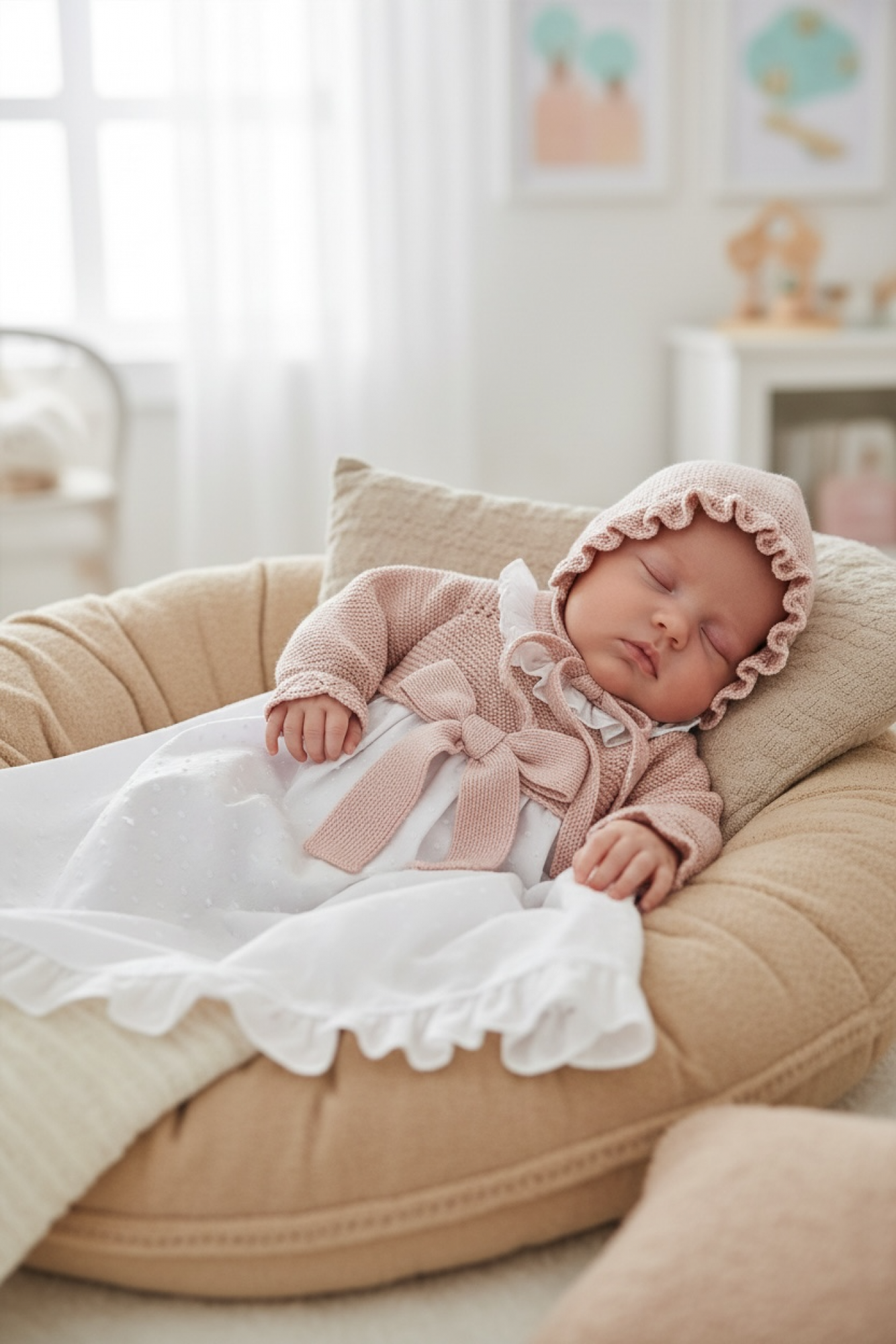 The pale pink knit bonnet frames the face with a delicate finish and harmonizes perfectly with the set.