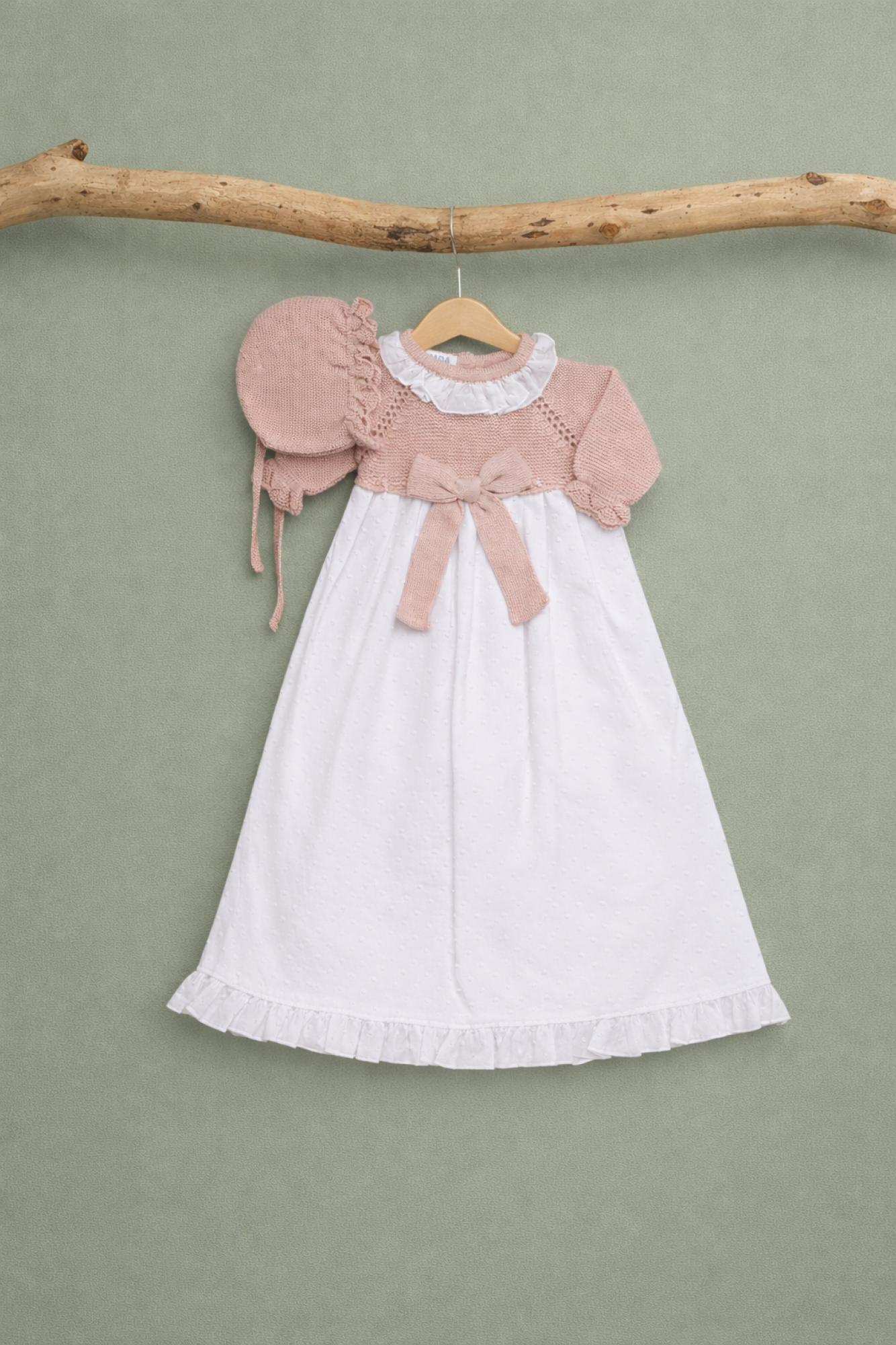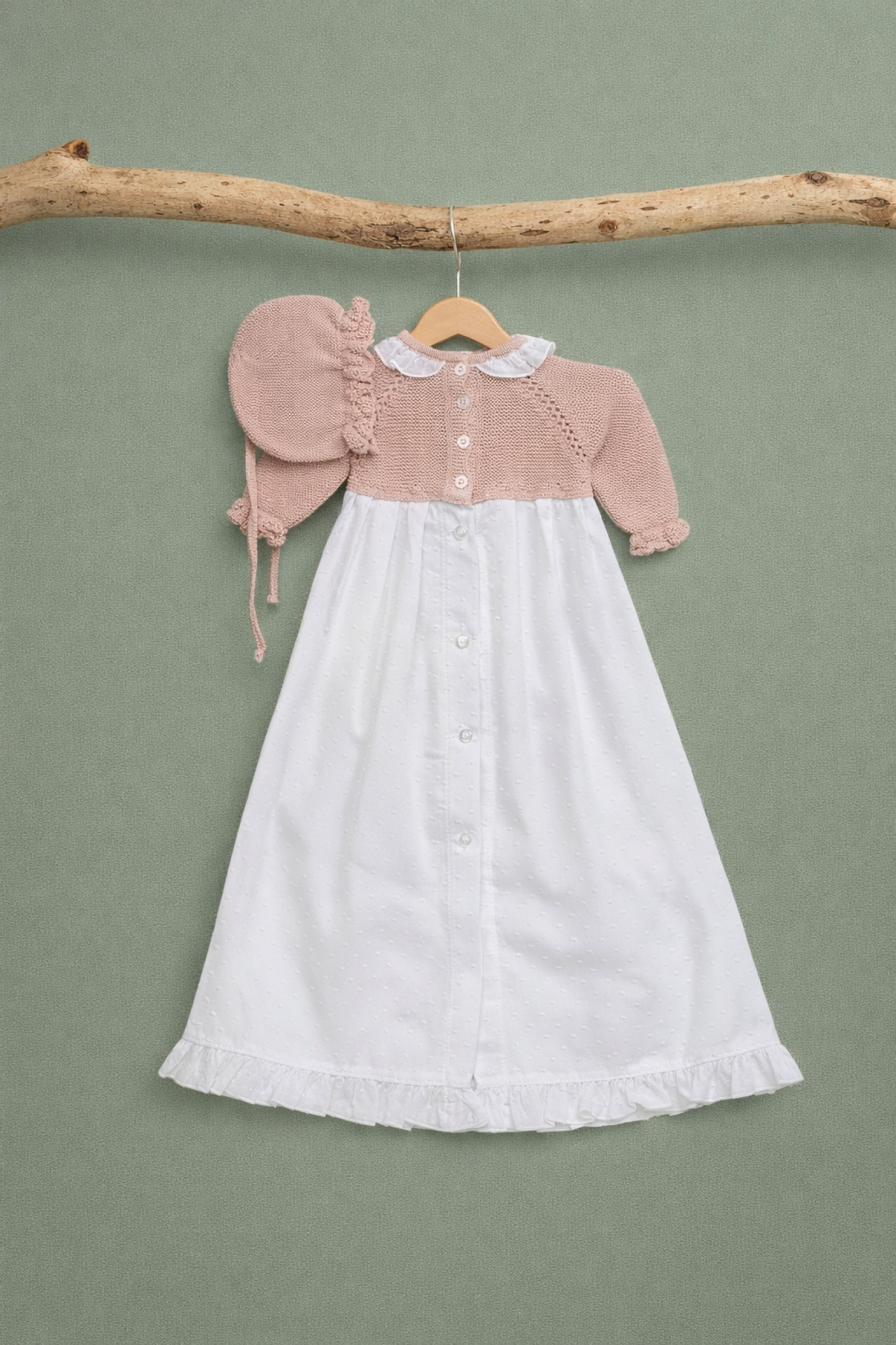 A matching set consisting of a white plumeti dress and bonnet, combined with pale pink summer knit.