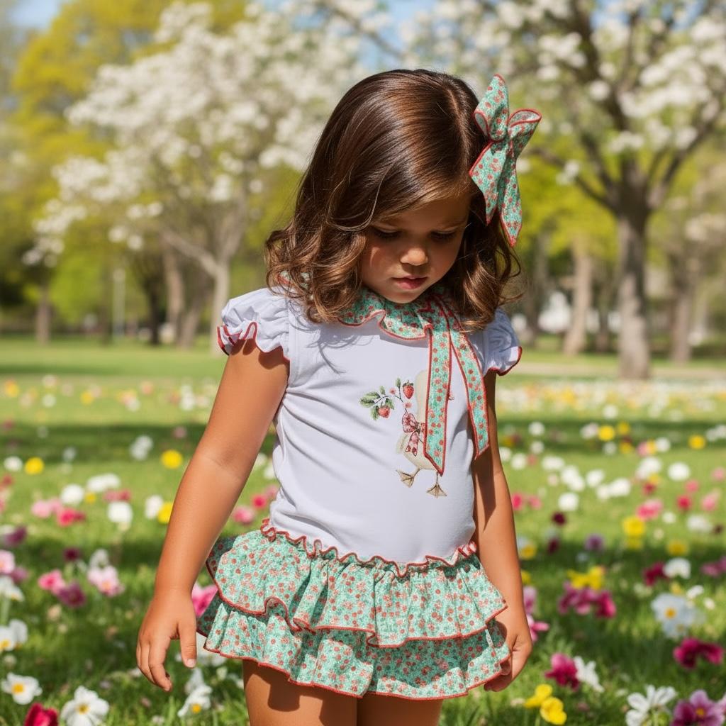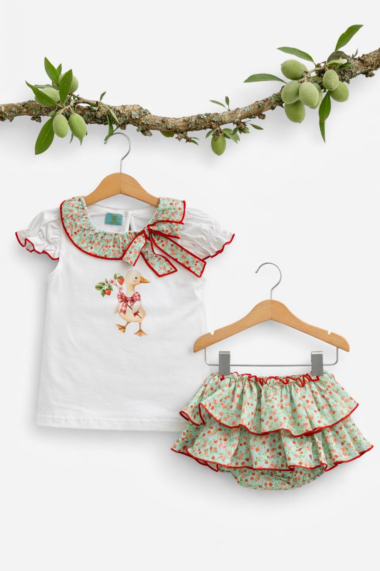 The skirt is made of batiste with an aqua print and small coral flowers. It has a double ruffle that adds movement and volume, finished with coral trim that highlights the entire outfit.