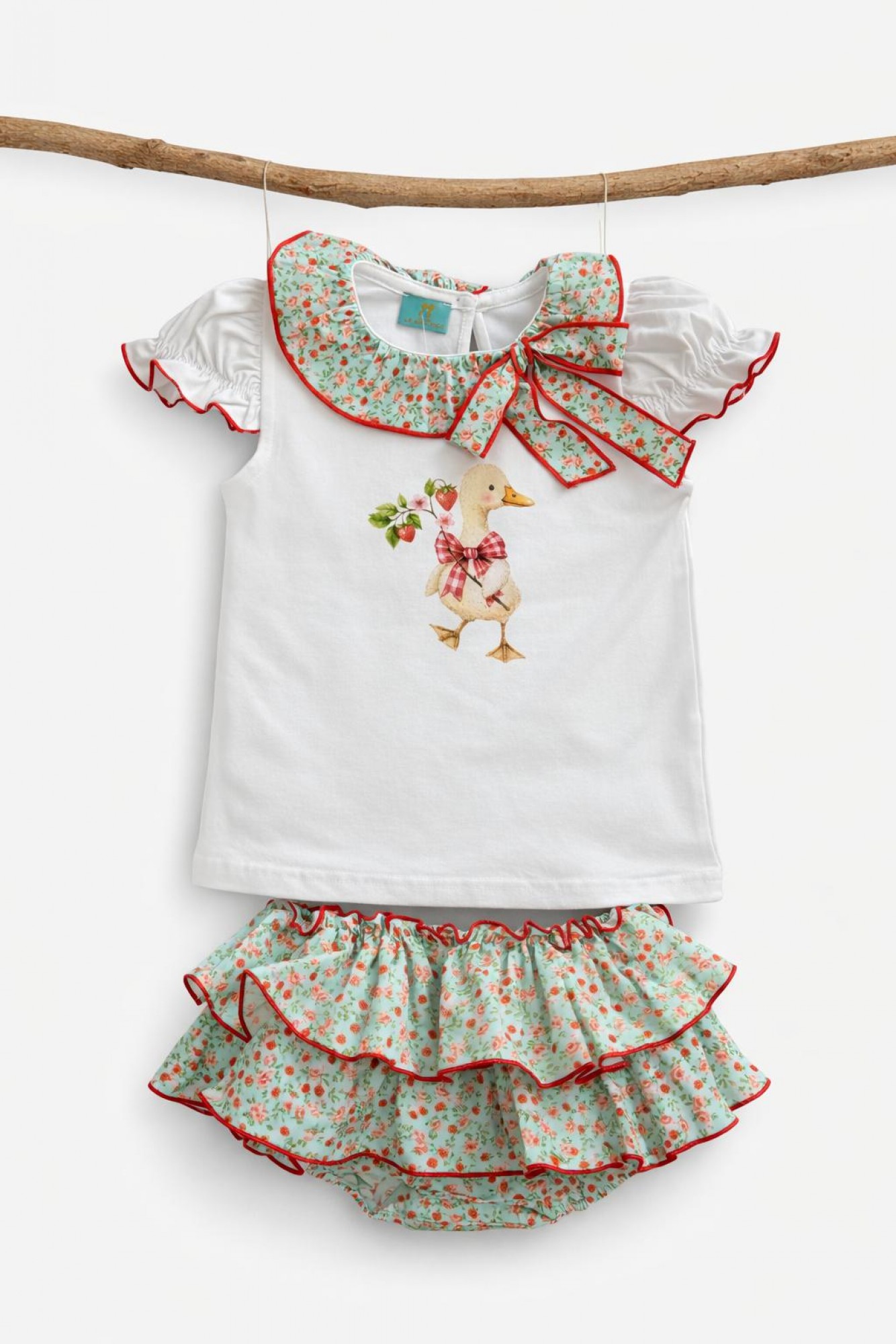 The t-shirt is made of soft, comfortable white cotton with short sleeves finished with a ruffle and coral trim. The standout feature is the aqua-colored printed collar with a small coral floral design, paired with a matching side bow. The front features a delicate duckling print with flowers and coral detailing, adding a sweet and summery touch.