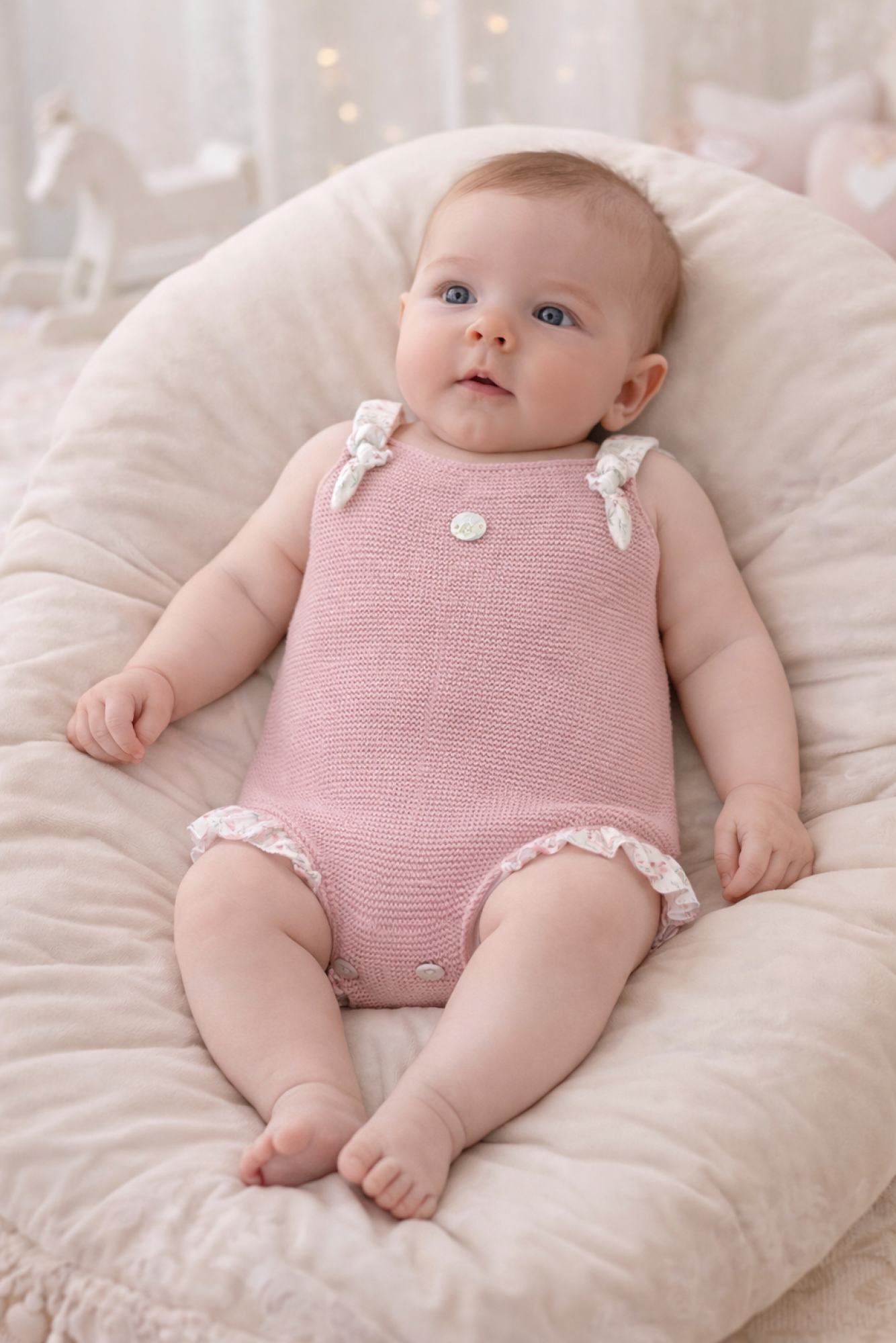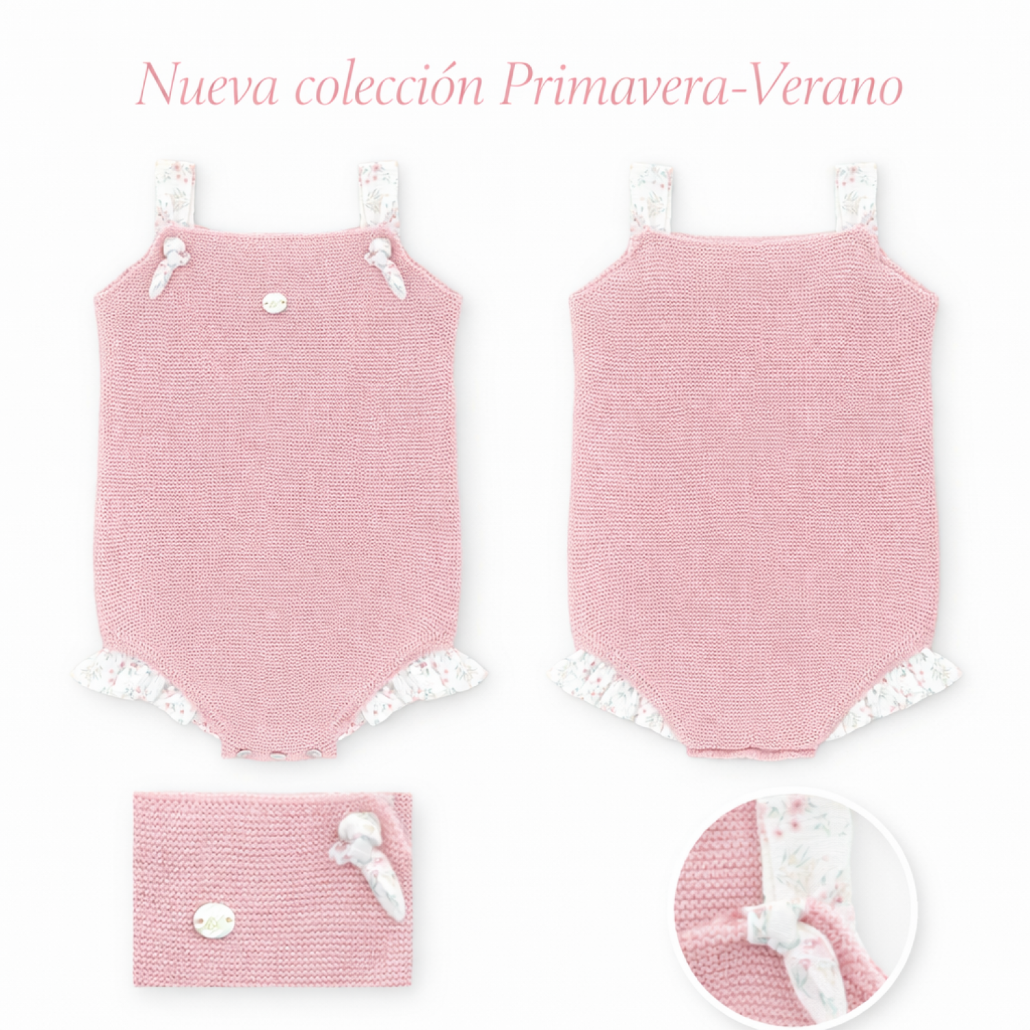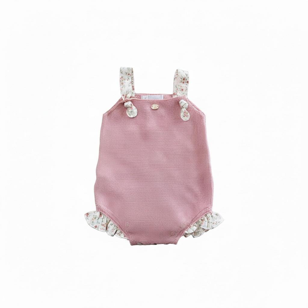 Knitted in a fine knit with a uniform texture, it's soft and breathable, perfect for baby's sensitive skin. The wide straps in a contrasting floral fabric add a touch of romance and are finished with decorative bows in the same print, creating a special look.