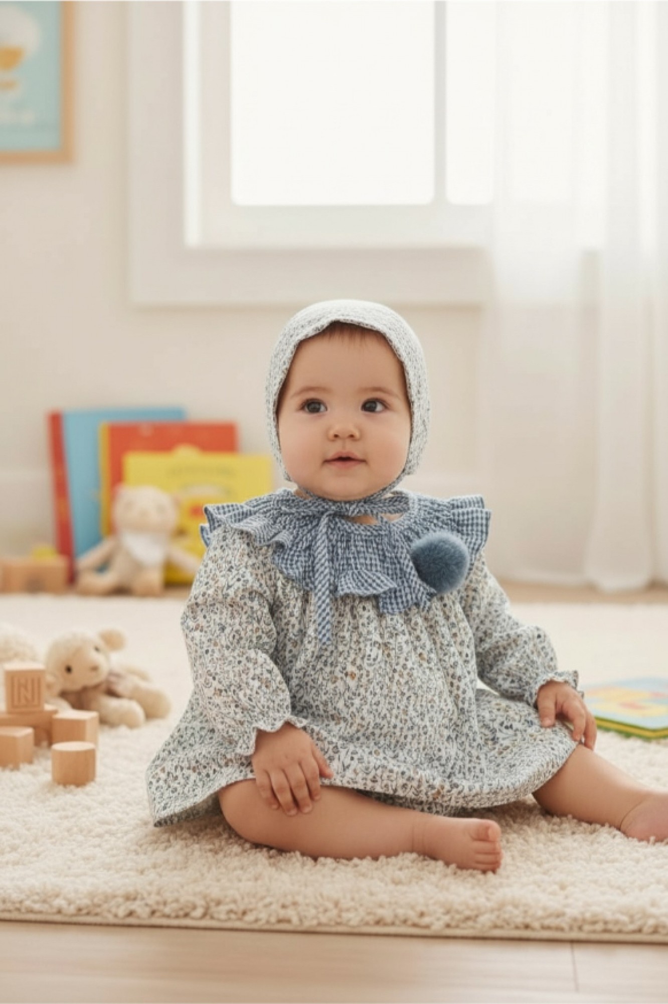 Composed of a dress with panties and a bonnet. Made of batiste with a floral print, it features a ruffled collar and a navy gingham bow. A cute fur pompom is also featured.