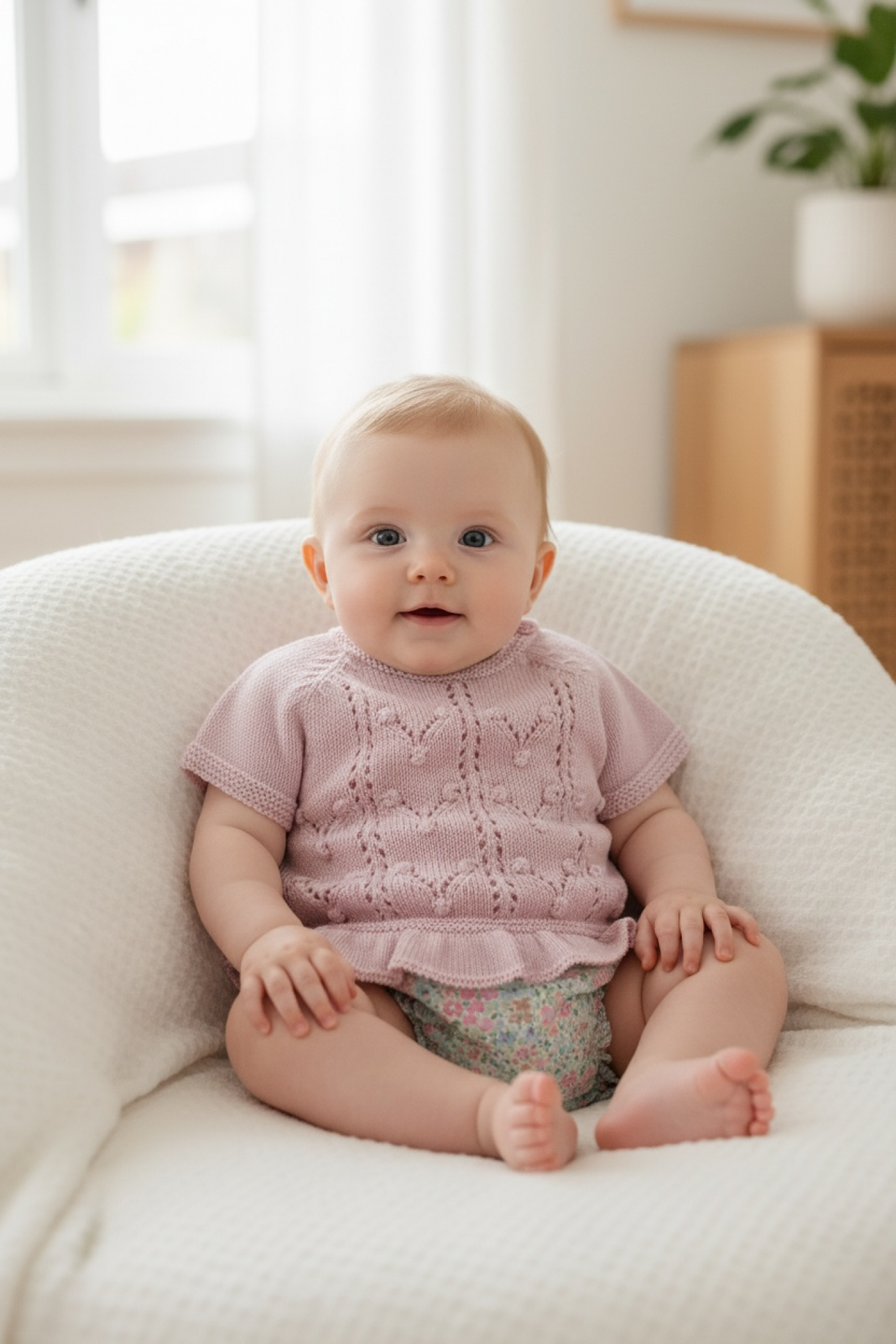 The top features short sleeves, a round neck, and a textured knit pattern, finished with a small ruffle at the hem.