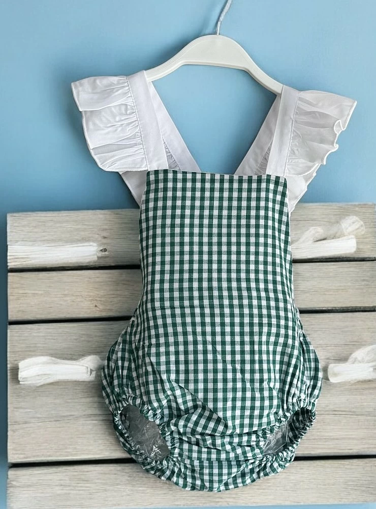 Made of moss green and white gingham batiste. It features straps with a white ruffle. Ideal for wearing alone or with a shirt bodysuit underneath.
