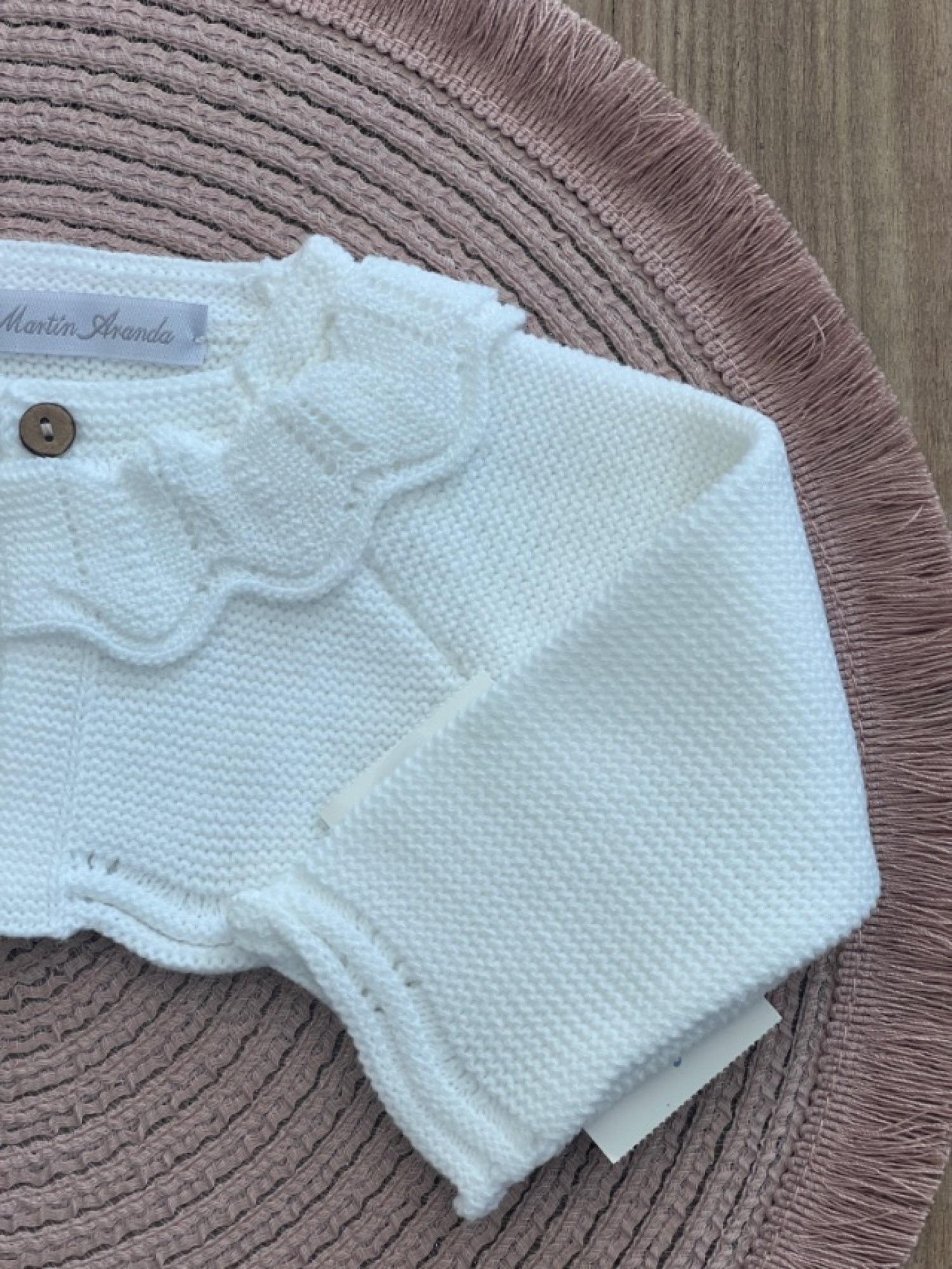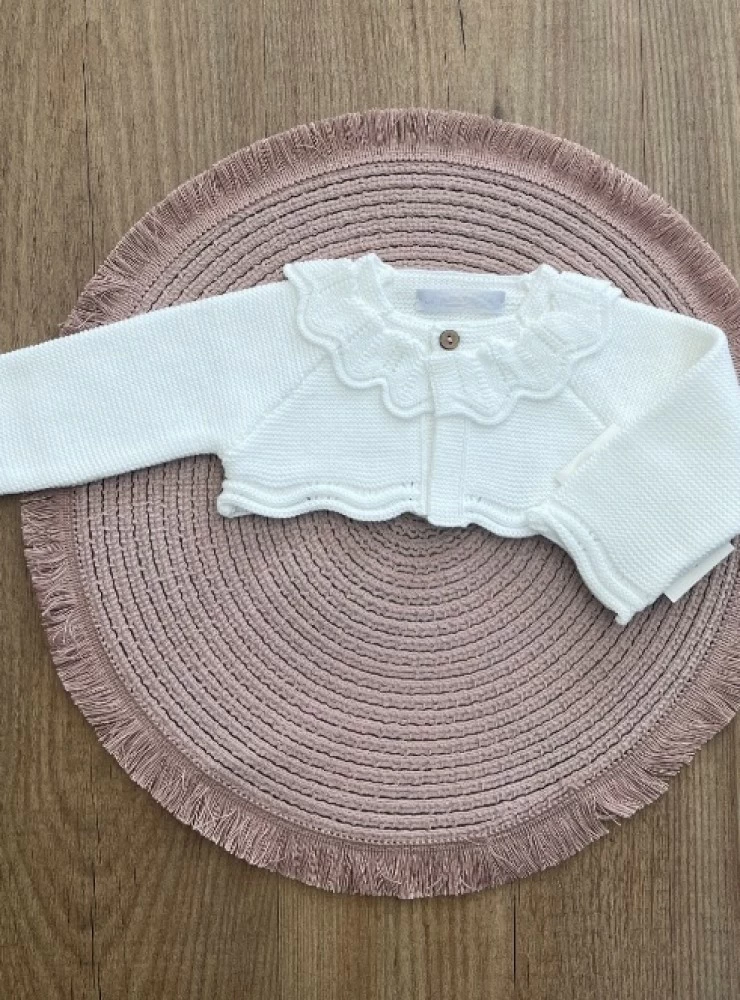 Made in plain knit with wavy necks as well as hem and cuffs. It is cava color (light beige) ideal for dresses, skirts or jesusitos.