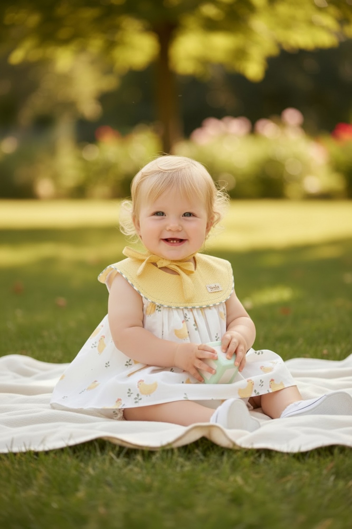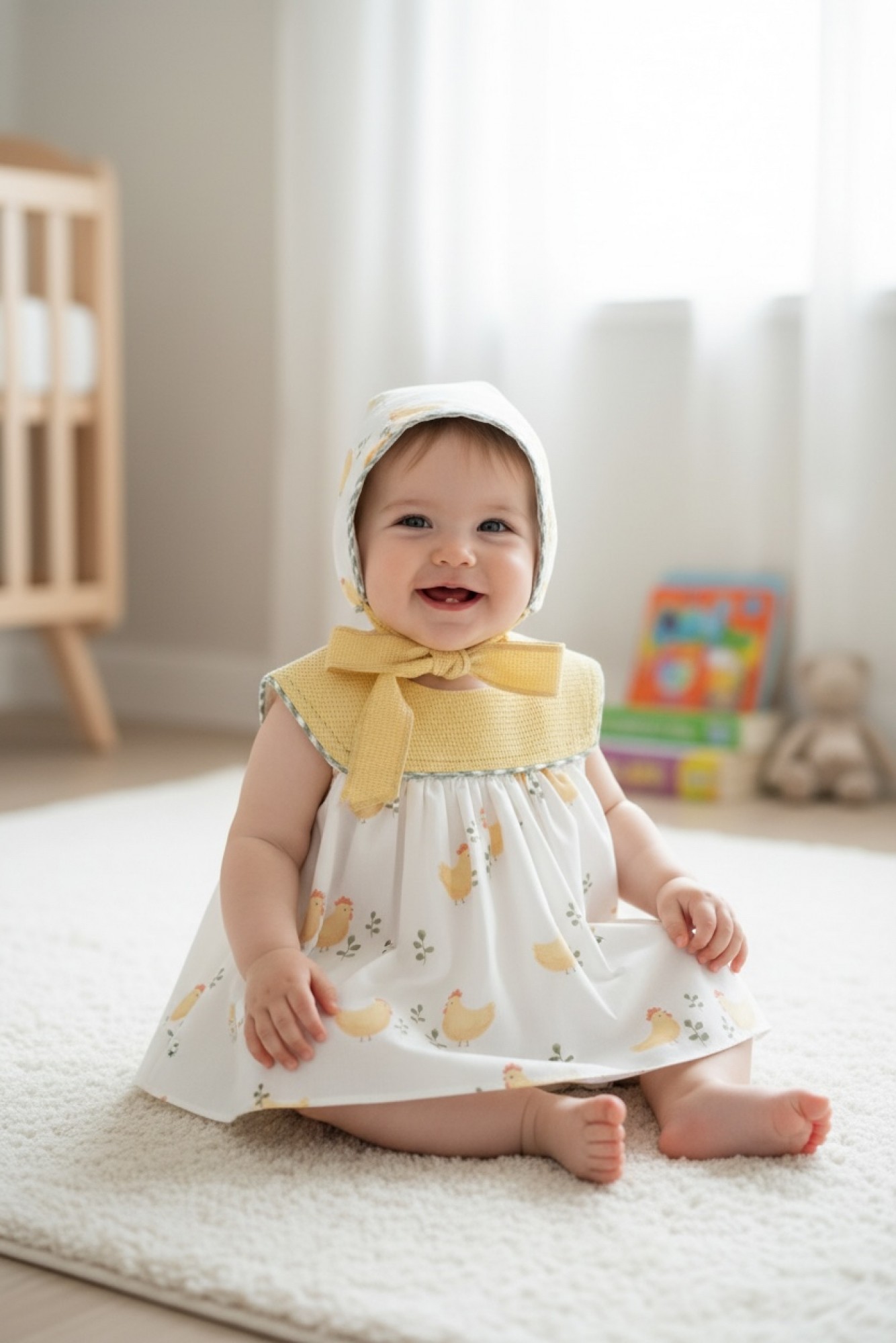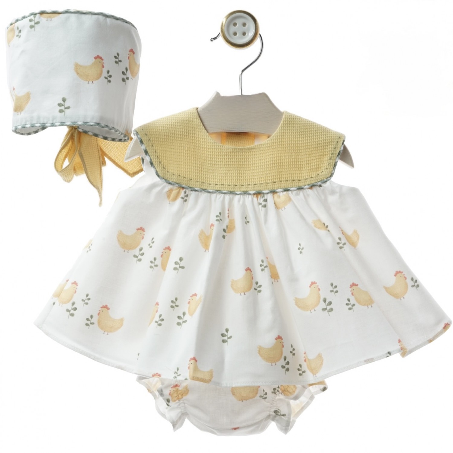 Baby outfit consisting of a dress, bloomers, and bonnet, made from lightweight fabric with a delicate print of hens and nature motifs, characteristic of the Ánfora collection.