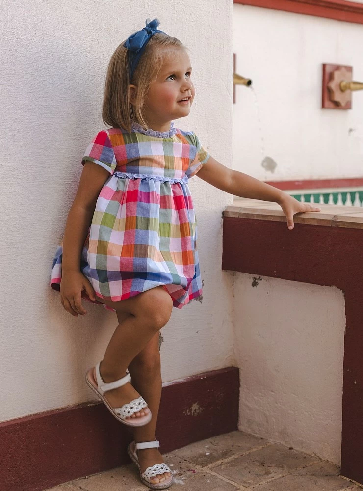 Cotton poplin dress with squares in various colors. He has a wonderful back