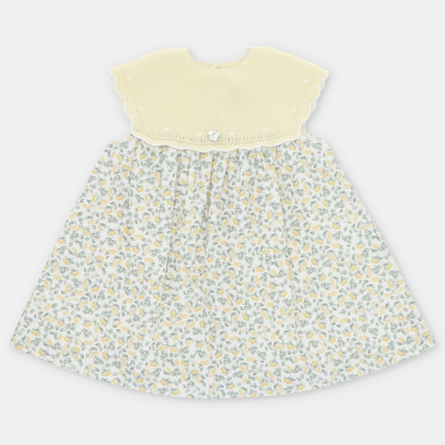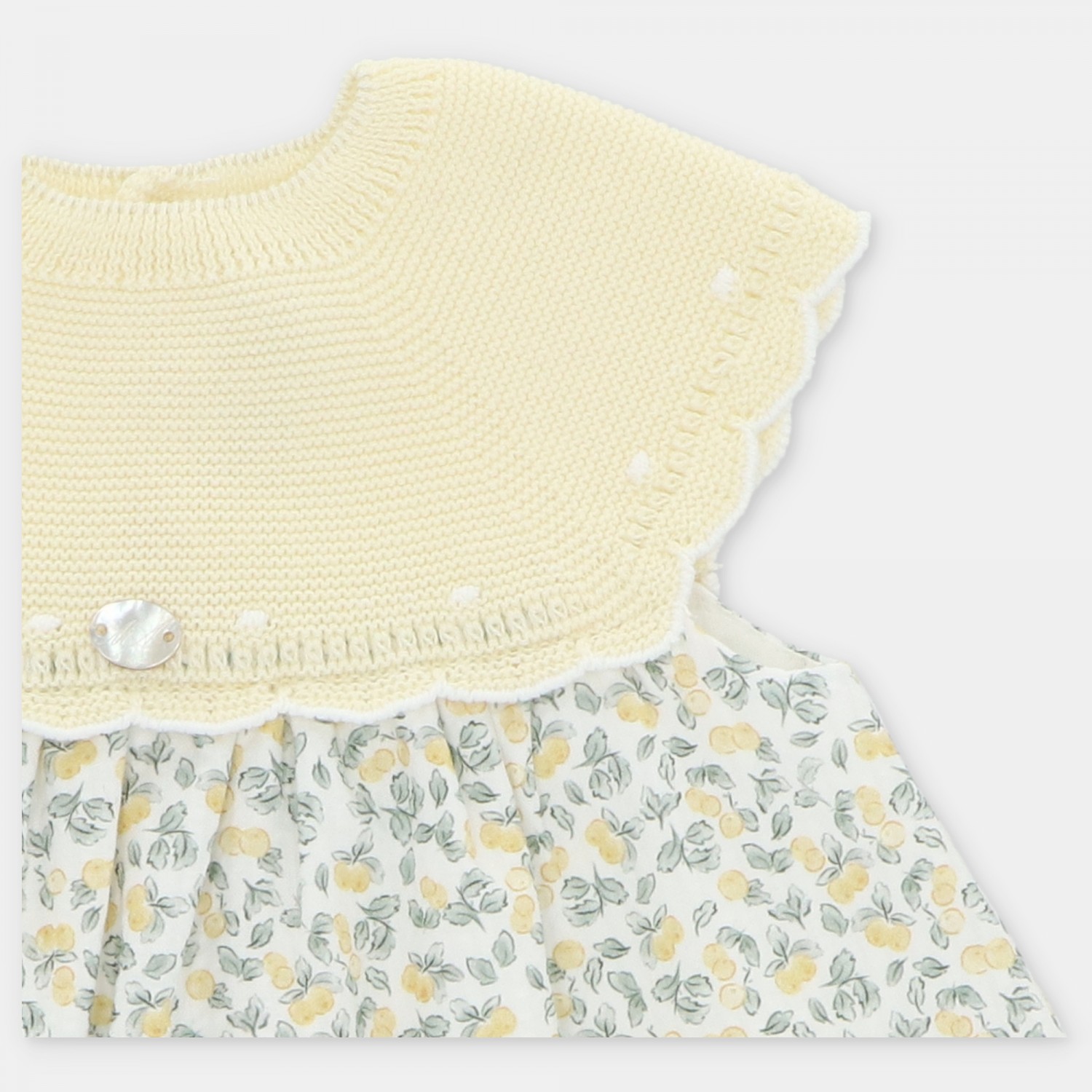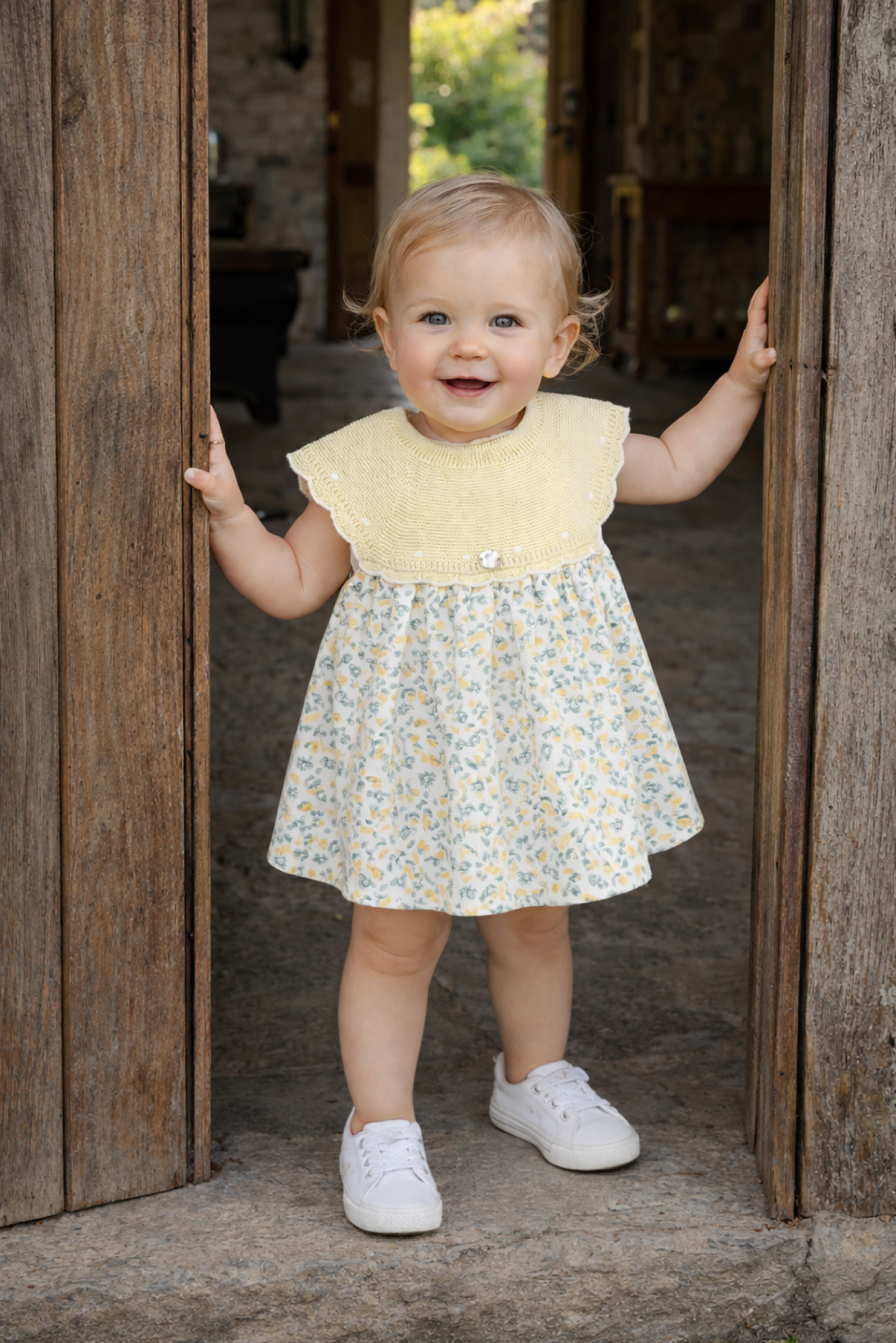 The bodice is crafted from soft yellow knit with delicate decorative lace and a scalloped hem and ruffled sleeves.