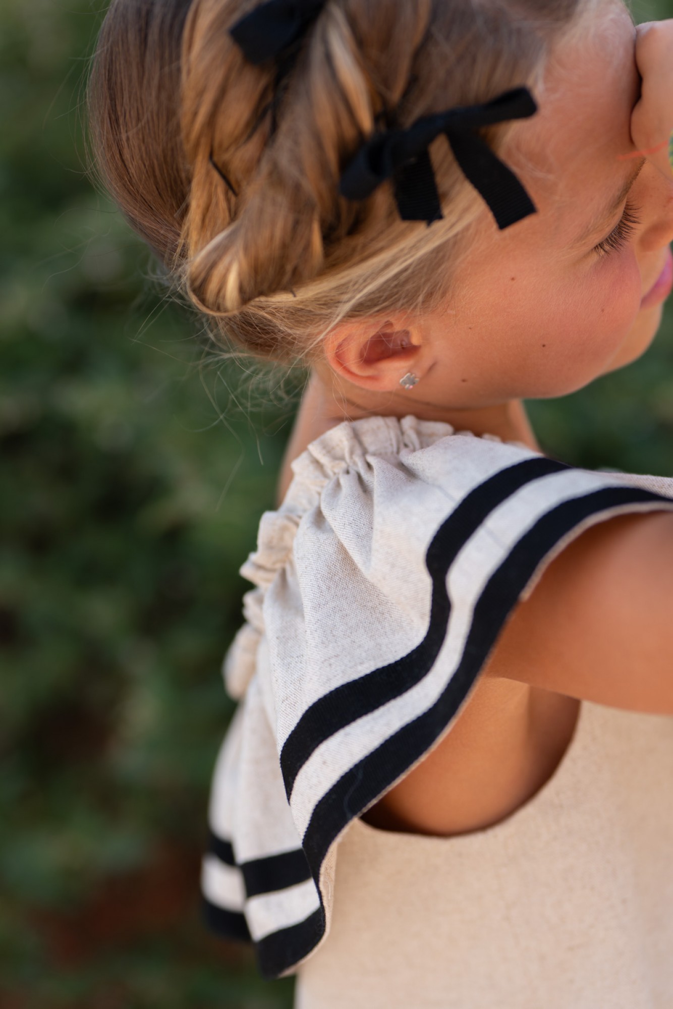 Designed in soft, lightweight linen in a natural sand beige tone with a subtle heathered finish characteristic of the fabric. It's cool, breathable, and has a flowing drape, ideal for spring and summer days. A standout feature is the wide ruffle at the neckline with delicate gathering, which wraps around the shoulders and back, adding movement and a unique touch. The ruffle incorporates a double black stripe that creates an elegant and defined contrast, adding character to the design.