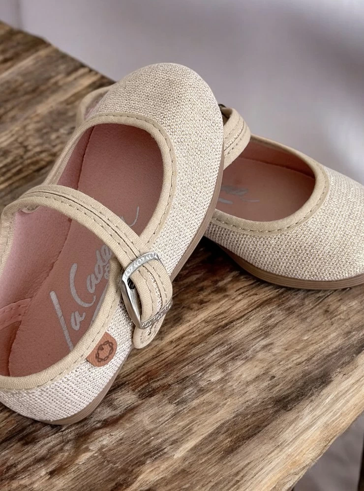 Made of gold-plated linen, it features a buckle fastening, a padded insole, and a rubber sole. Flexible and perfect for a comfortable and beautiful look.