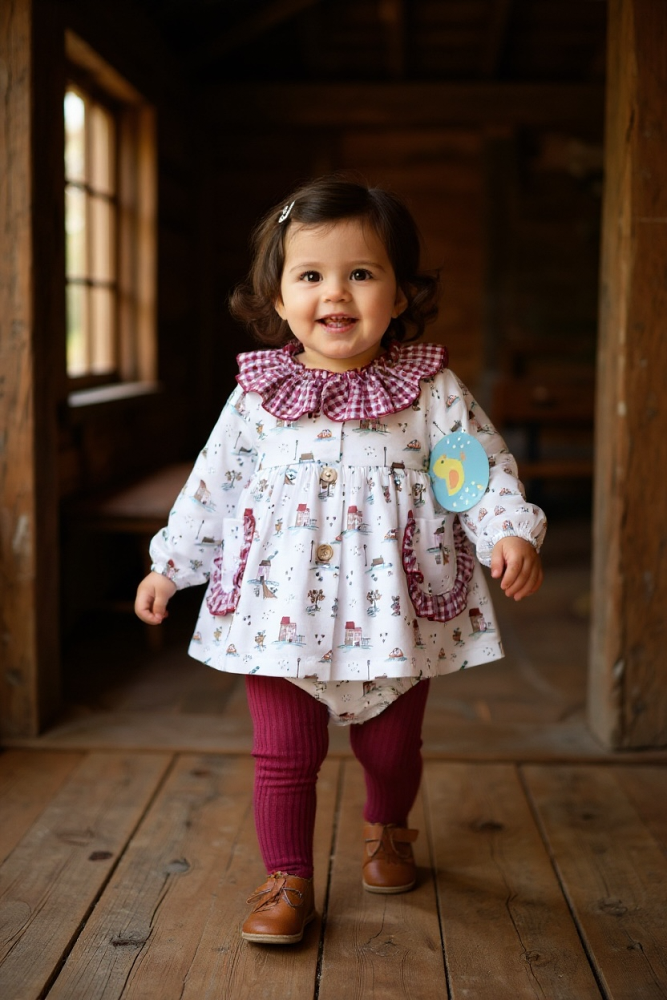 Delicate long-sleeved dress with a charming country print on a white background, decorated with a ruffled collar and pockets trimmed in burgundy gingham with a wavy hem. The wooden front button placket and matching panties complete this design full of tenderness and charm.