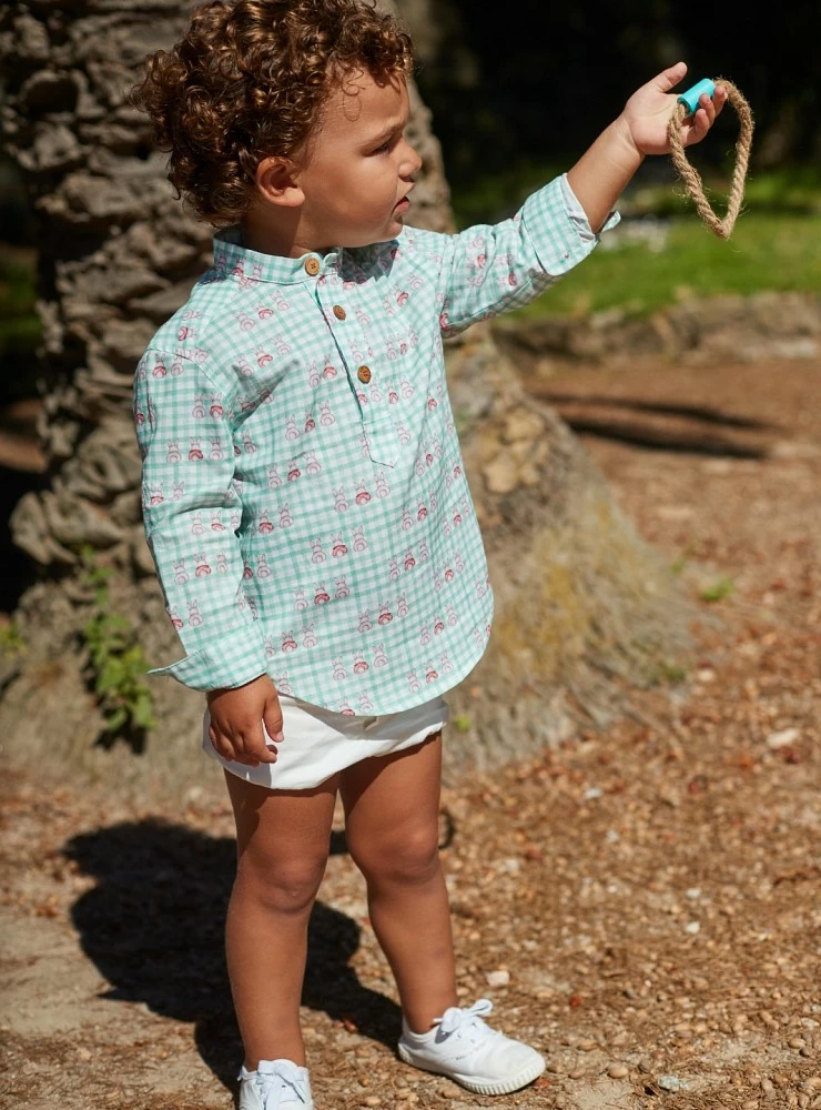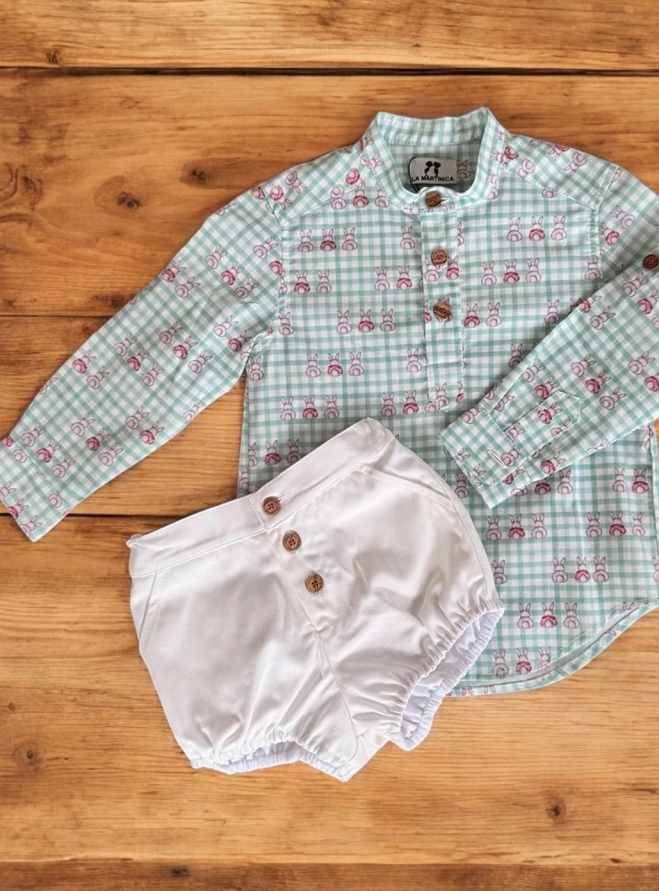 Green and white gingham poplin shirt with cute rabbits, long sleeves with buttons at the elbow so you can roll them up in summer and a mandarin collar with three buttons at the front. Ecru canvas baggy trousers