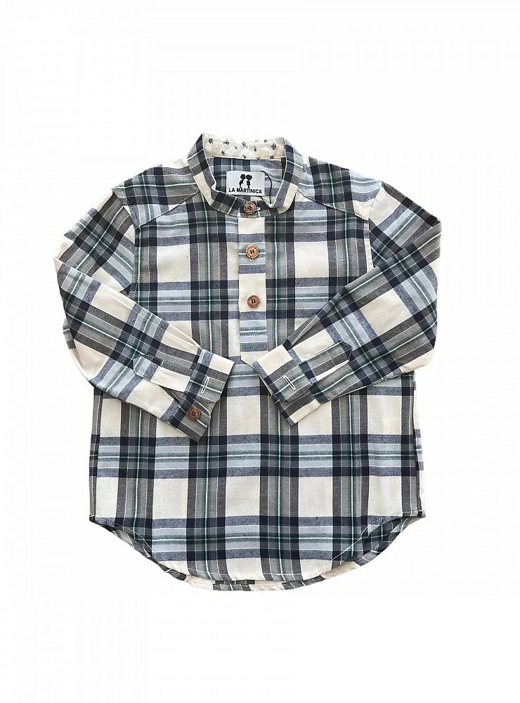 It is made of finite viella with squares in shades of sand, navy and green. It has a mandarin collar with green liberty flower interior. Wooden buttons as a detail. We have matching Jersey from this collection, you can see it in related products below.