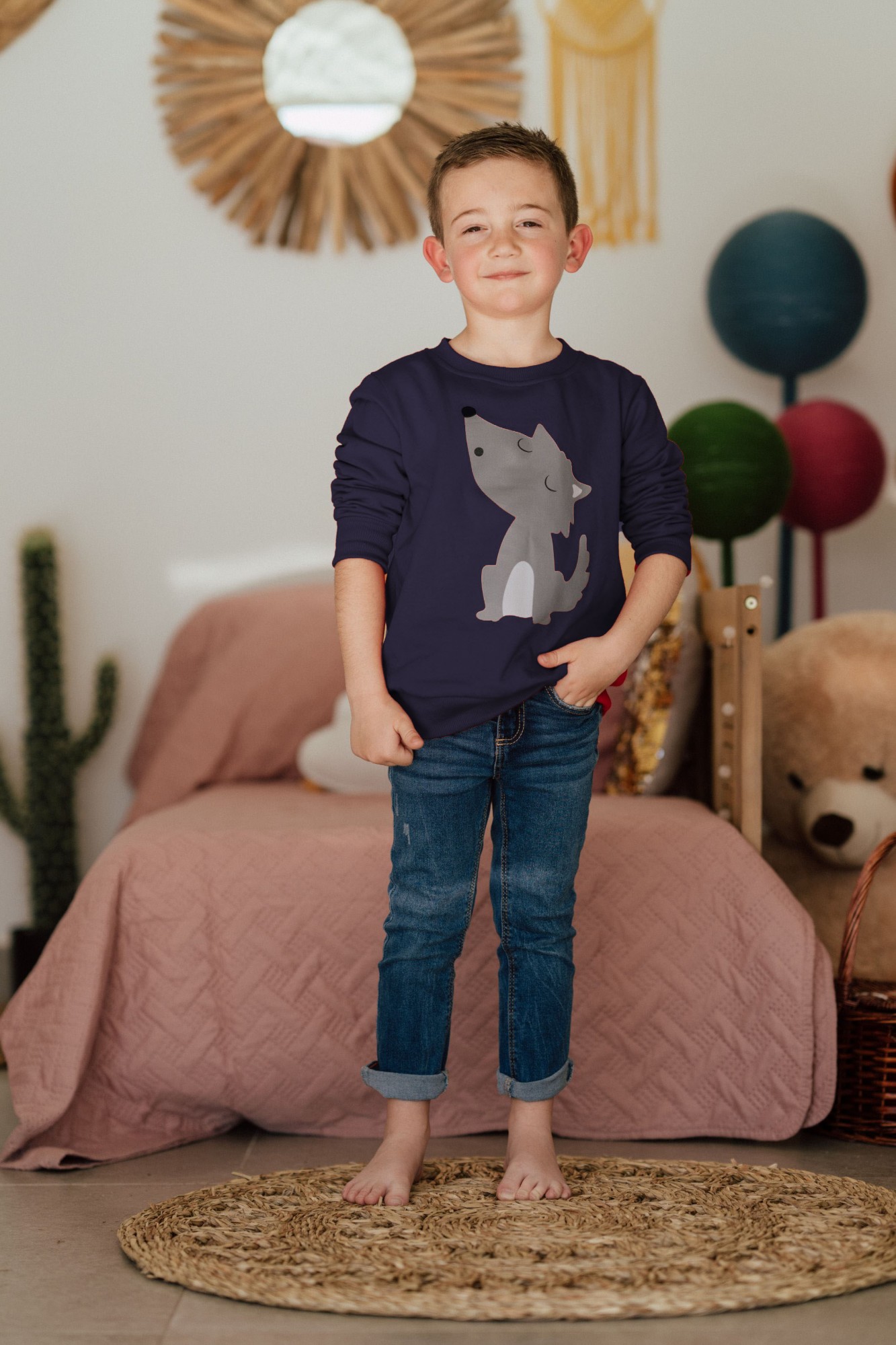 Made of cotton with elastane with plush interior. It has a drawing of the wolf in gray.