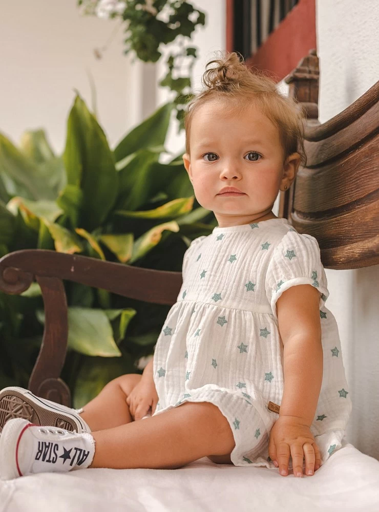 Muslin dress with embroidered star in powdery green. It is comfortable and simple.