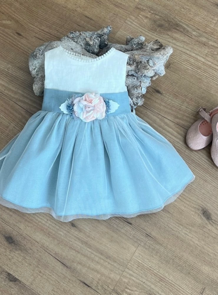 Made in beige and cobalt blue linen. It has tulle and a flower on the pink belt (it can be removed)