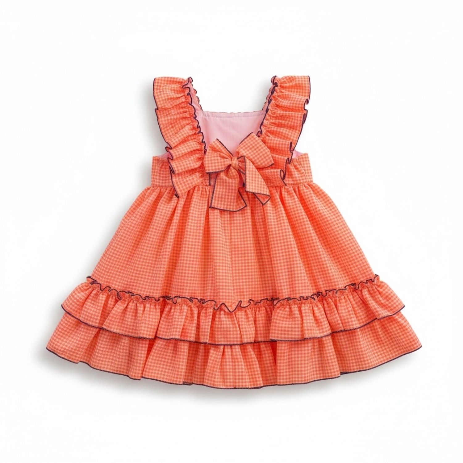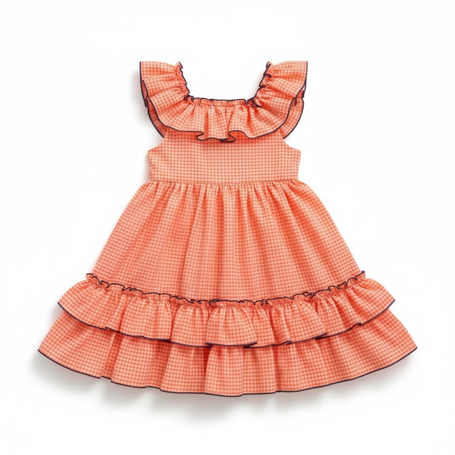 Perfect summer dress in a small gingham check, in a soft coral/orange tone with white, super flattering.