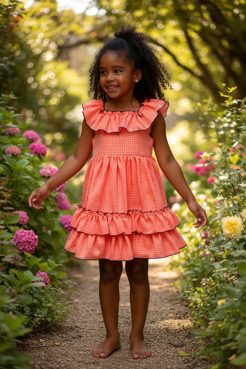 The skirt has a full, flowing skirt with a double ruffle at the hem, also trimmed with purple piping, so the dress moves beautifully and looks extra special when you walk.