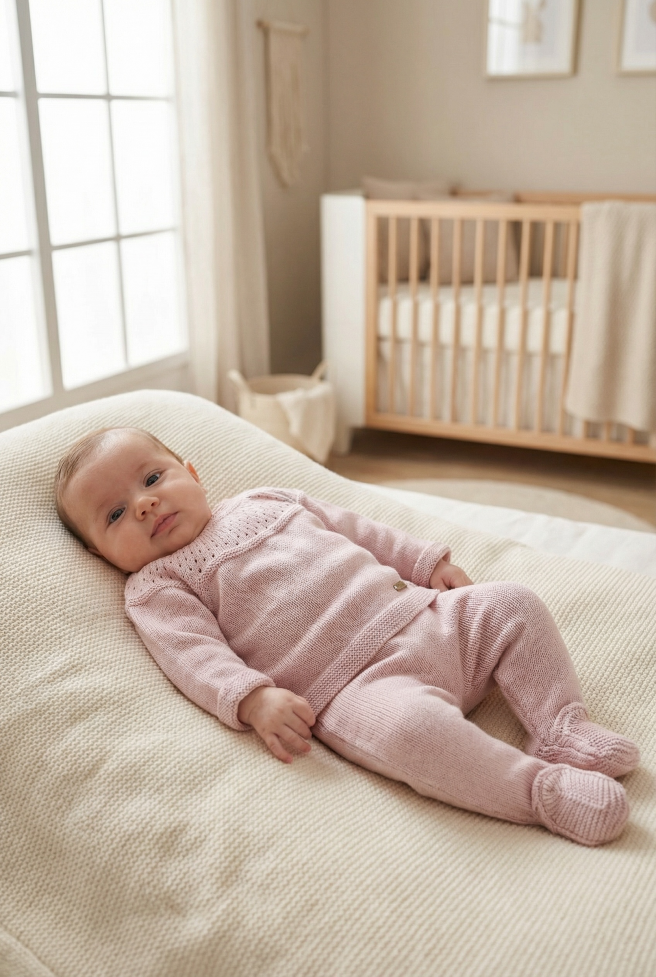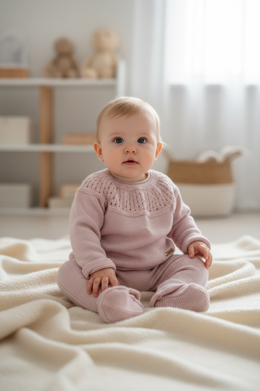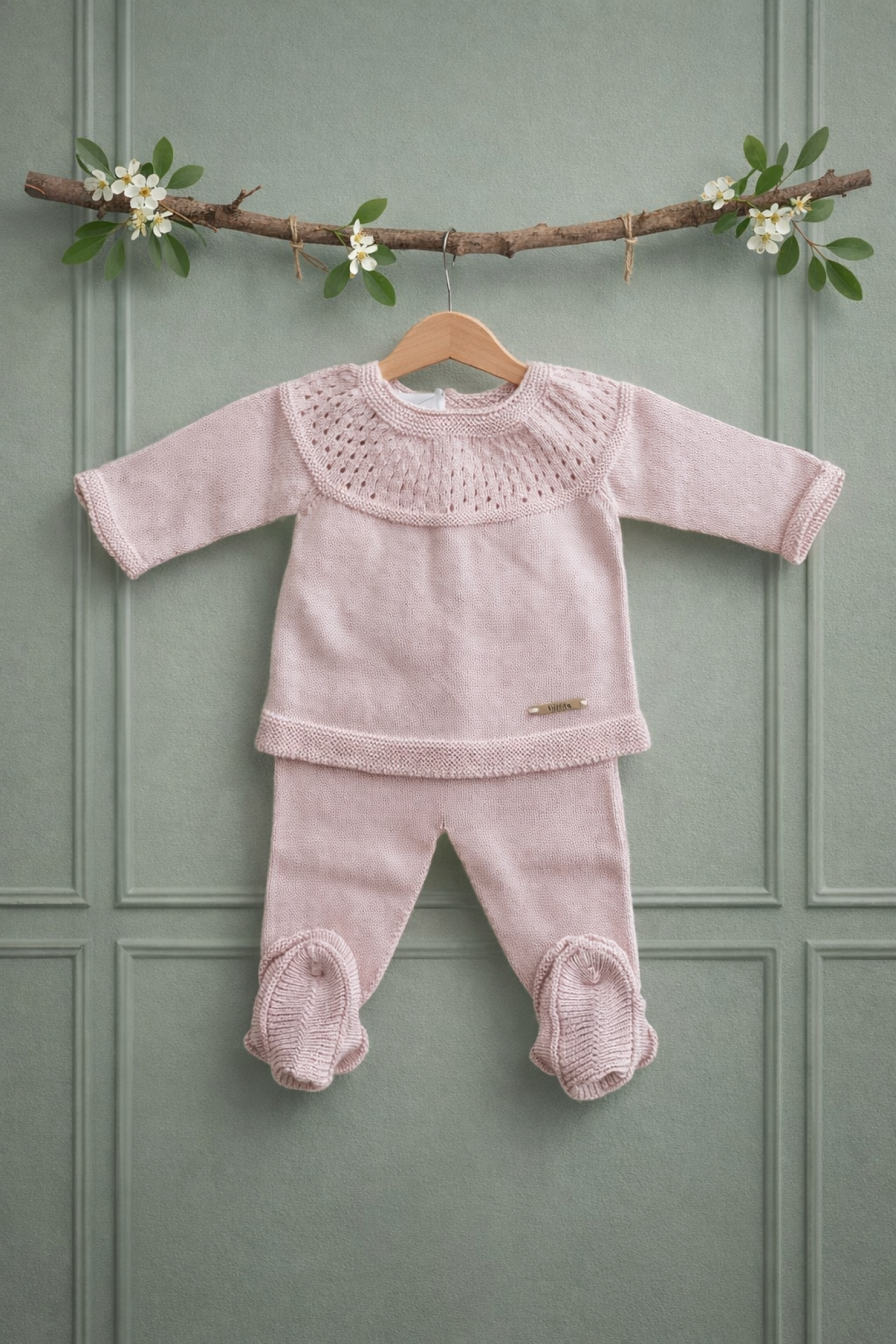 Baby girl's knit set in dusty rose, made from organic cotton.