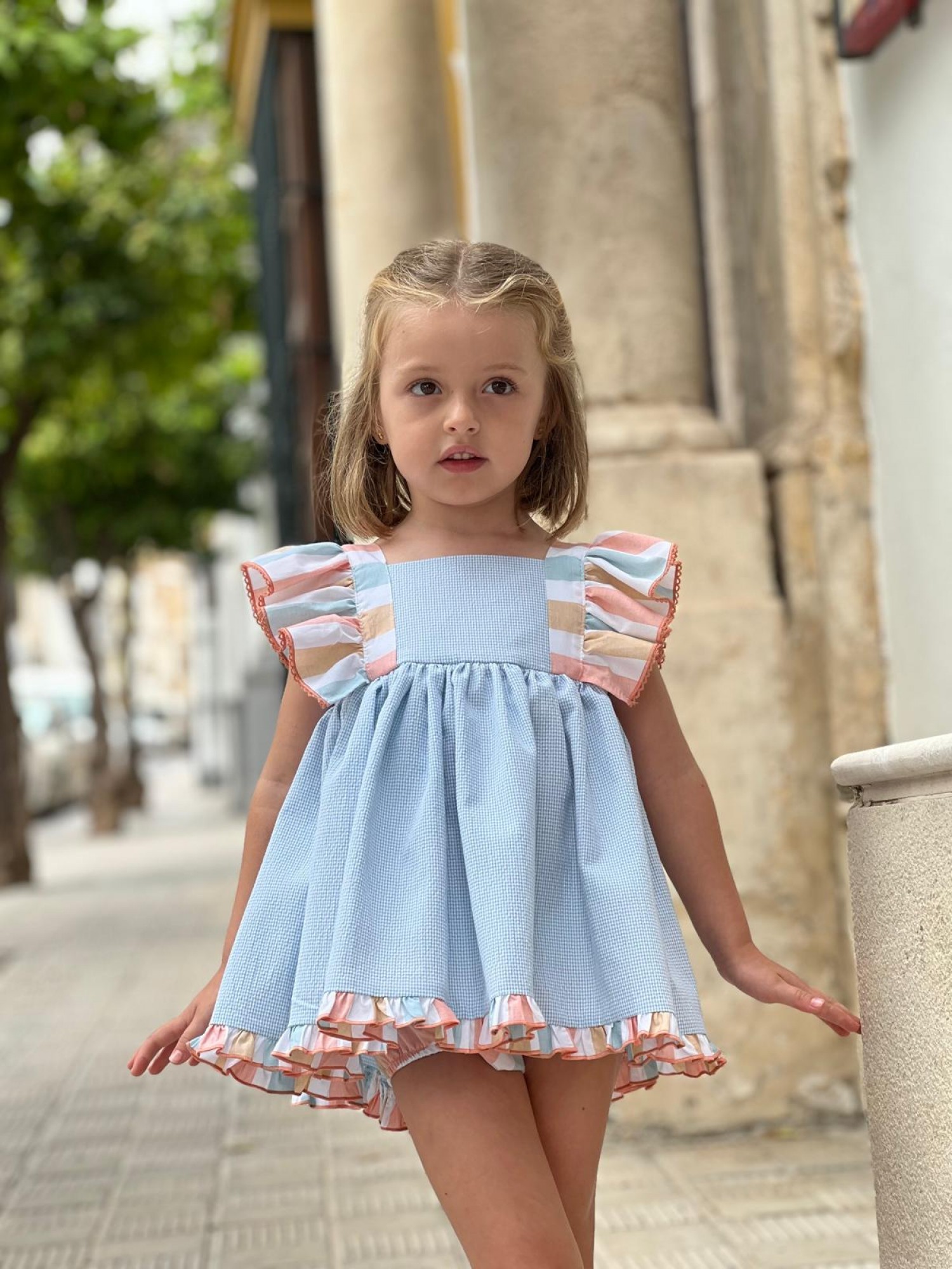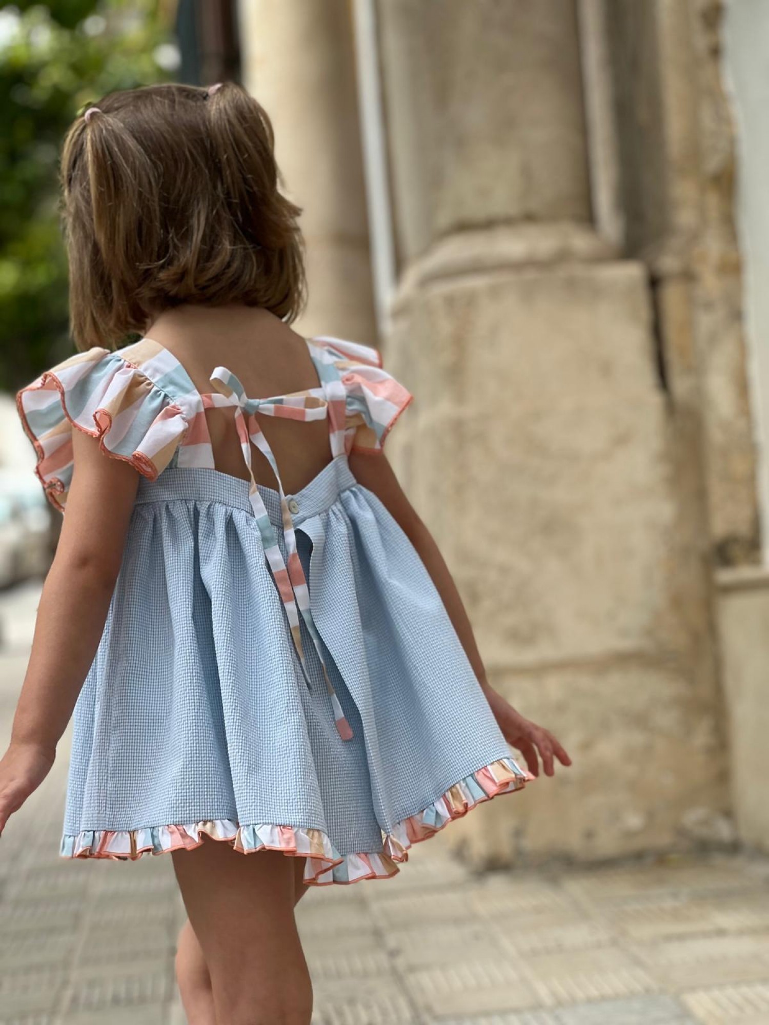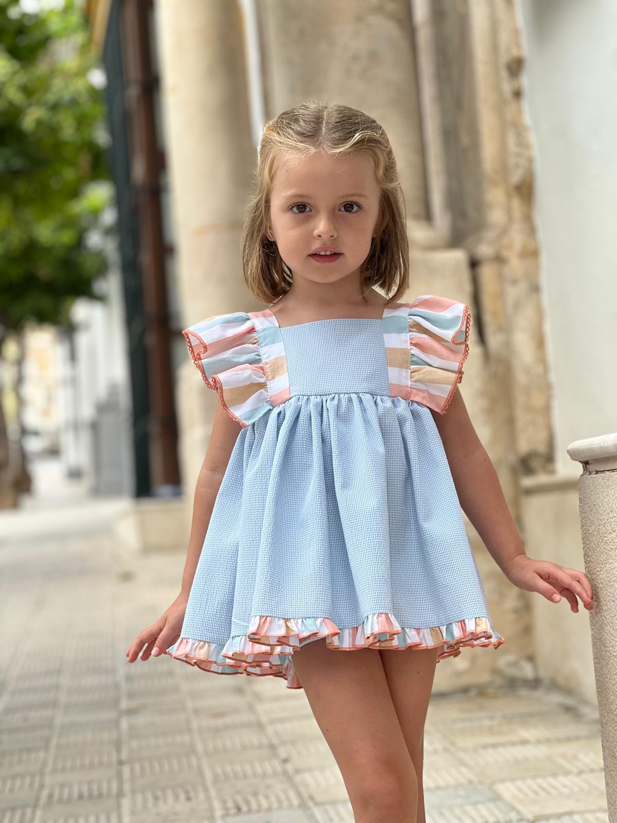 The shoulders are accentuated with ruffles in a soft, multicolored striped fabric—blue, coral, and beige—creating a sweet and summery contrast. This same fabric is also used for the bottom ruffle of the dress, finished with a delicate coral trim. The back of the dress is completed with a bow in the same multicolored striped fabric, adding a special touch.