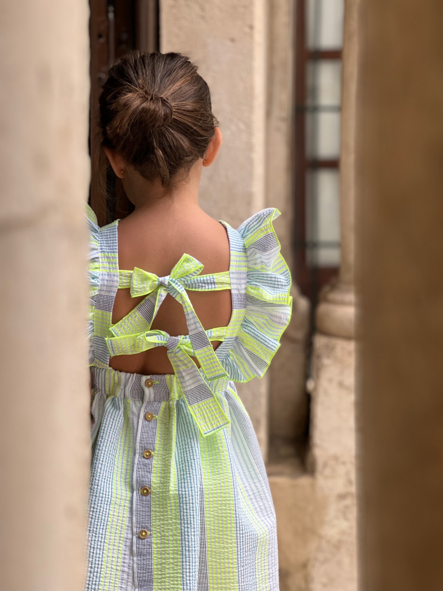 Made from striped Bambula in fluorescent, navy and aqua green tones. It is very original. It has sleeves with ruffles, elastic at the waist and back buttons with two pretty bows on the back
