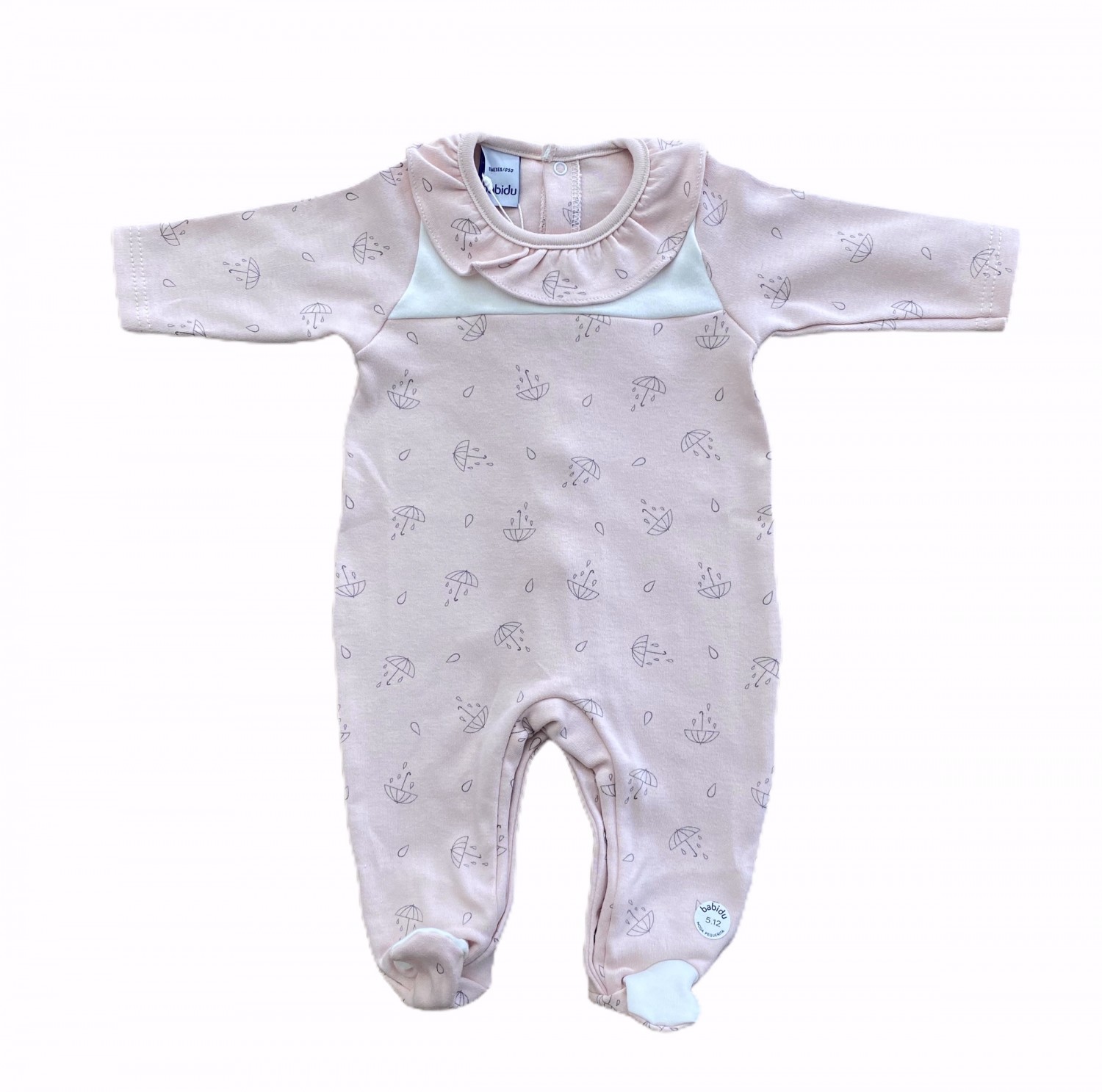 Made of 100 x 100 cotton, it has a wonderful quality. Nice pink romper with umbrella print. Pink with beige yoke. It has a ruffle collar. Very comfortable and fine