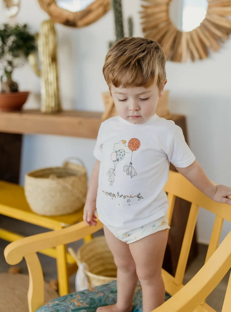 White cotton T-shirt with a nice print of rabbits and balloons and raw-coloured batiste bloomers with balloons and clouds. Very nice