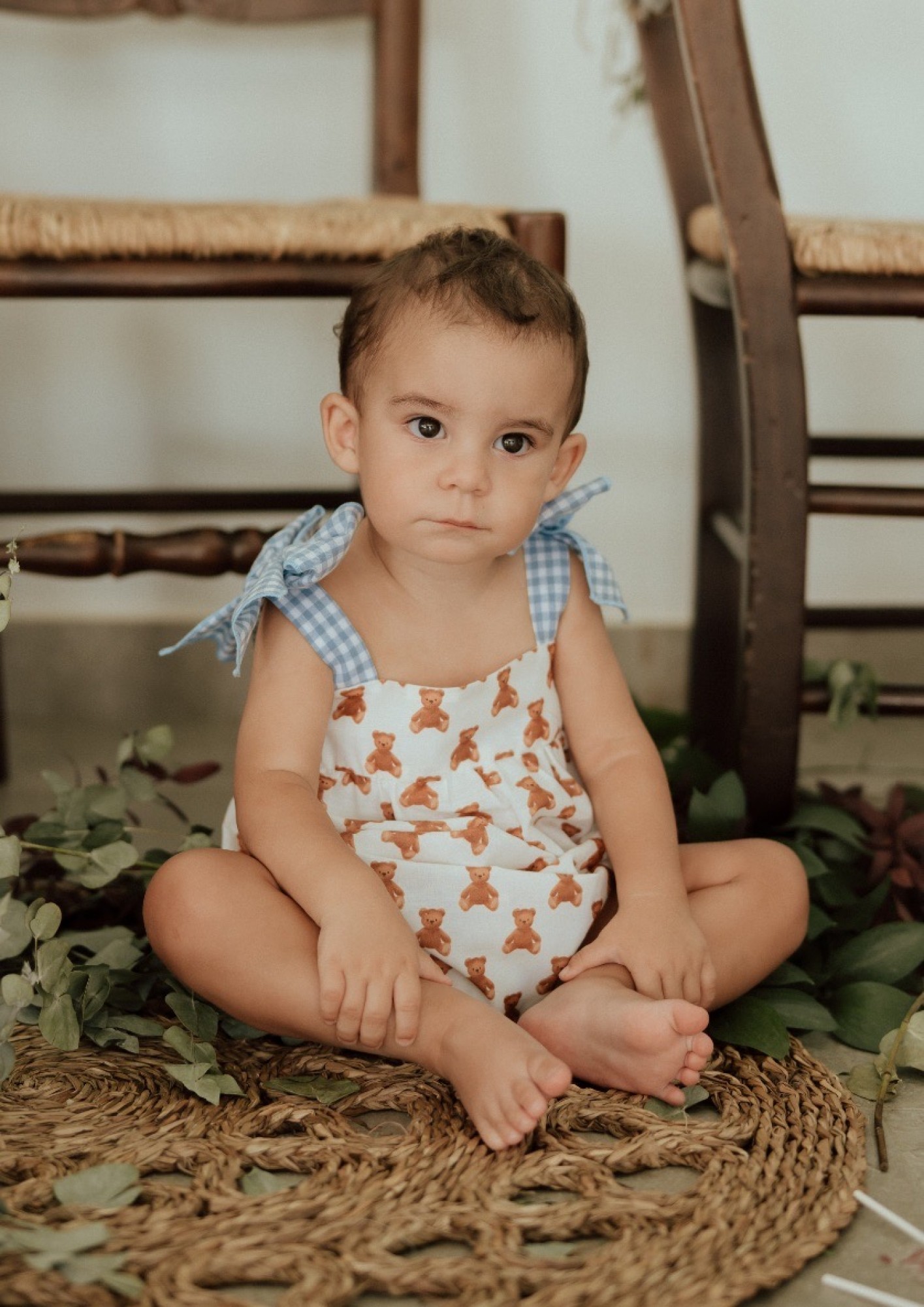 Made of 100 x 100 cotton poplin with bears and blue gingham shoulder ties.
