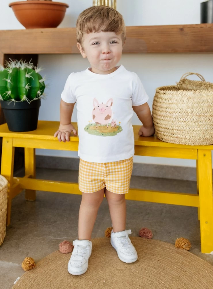 White cotton T-shirt with two cute little pigs and yellow gingham poplin trousers