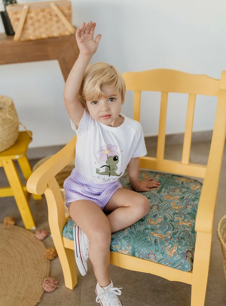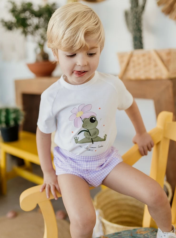 White cotton T-shirt with a romper with the phrase "Don't just grow, bloom too" and lilac gingham cambric bloomers. Very original.