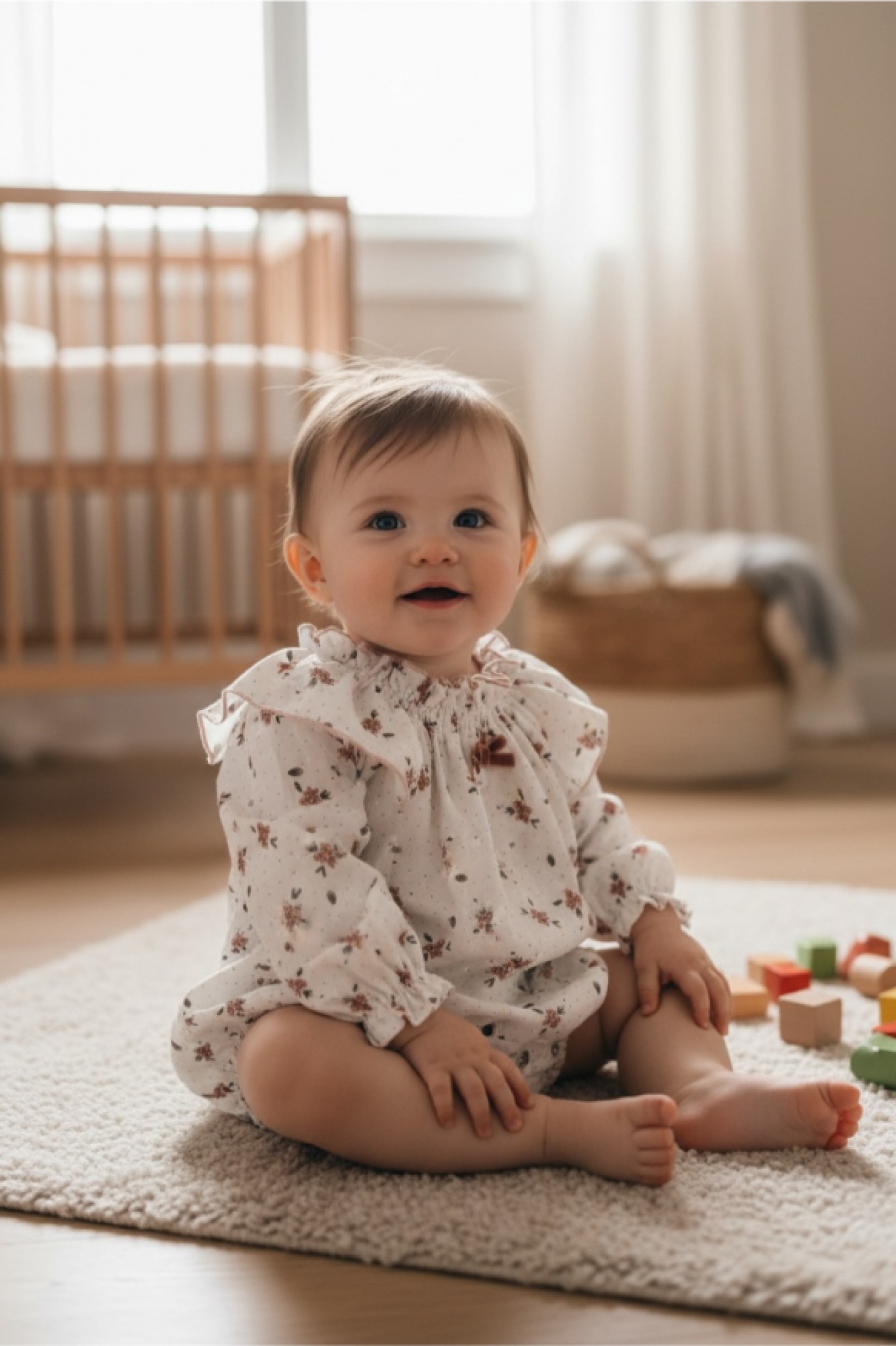 Long-sleeved romper in plumeti fabric with an ecru background and pale pink floral print. Gathered neckline with a ruffle and matching bow.