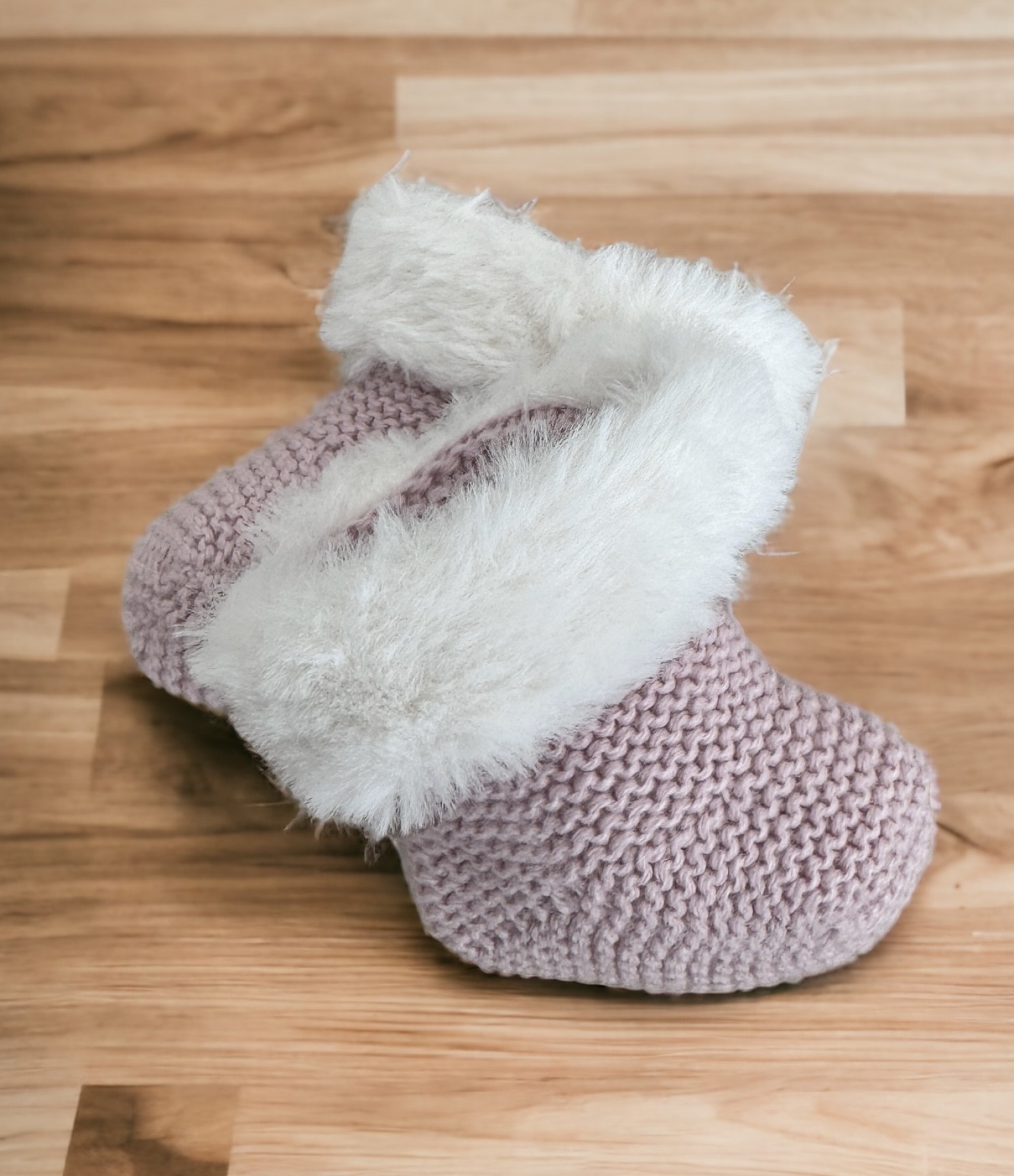 Made in blue or powder pink garter stitch with raw fur trim