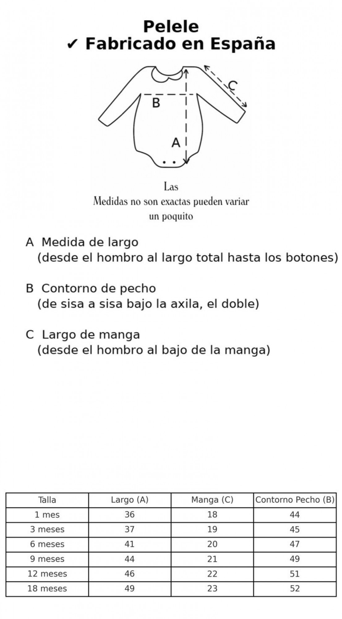 Size 12m → 45cm long from shoulder to crotch. 22cm sleeve length from shoulder to cuff and chest circumference from armhole to armhole 51cm.