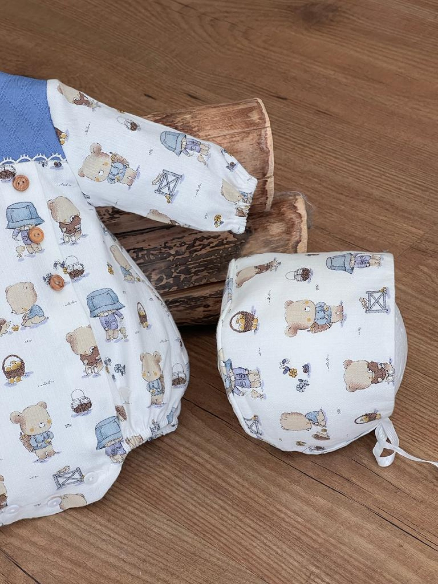 Made of beige herringbone fabric with a beautiful bear print. It has a powder blue body.