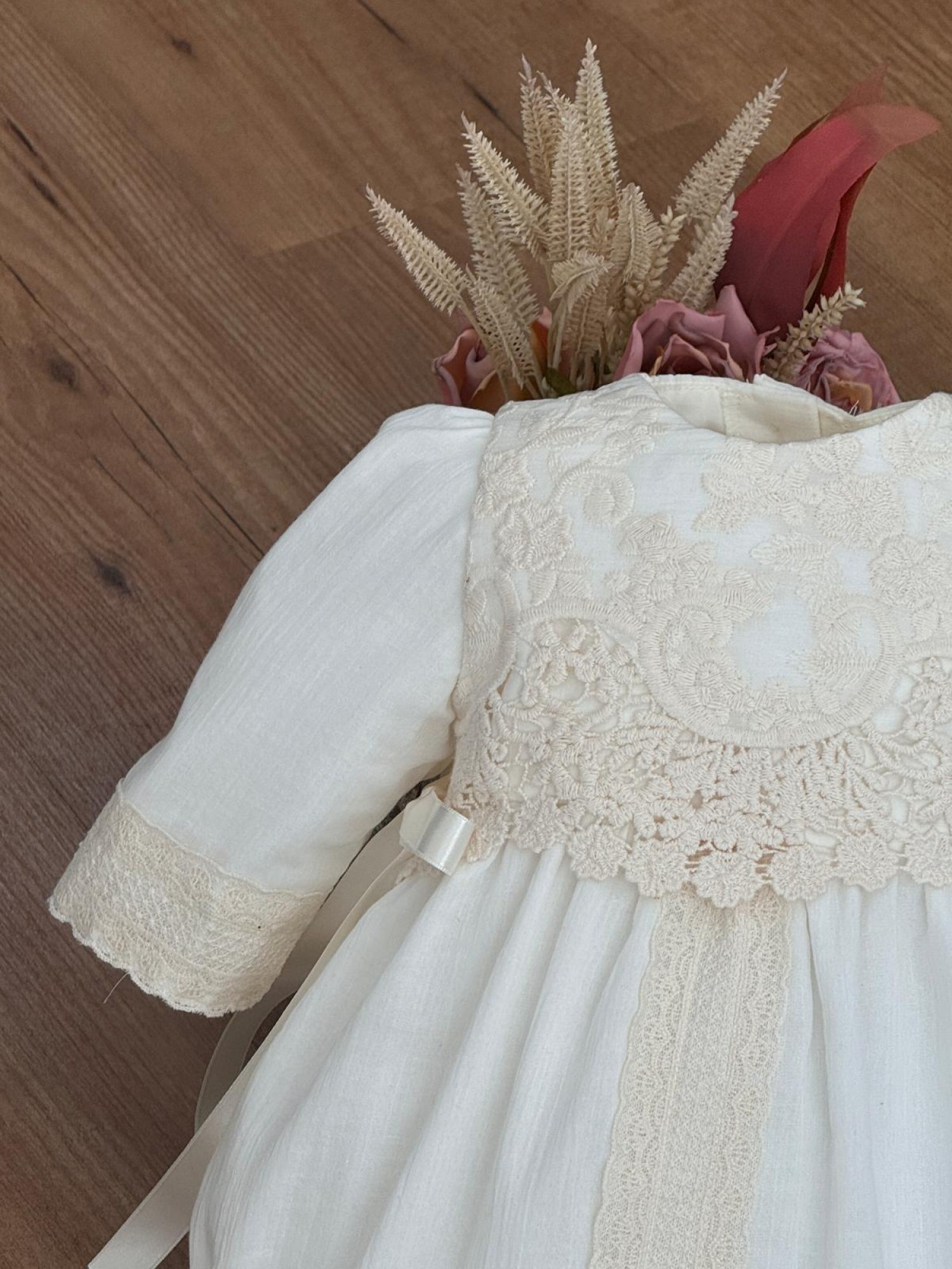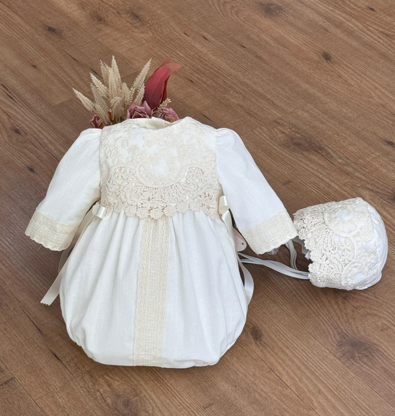 Made boal with capeline embroidery. With entrees and French sleeve. Beige