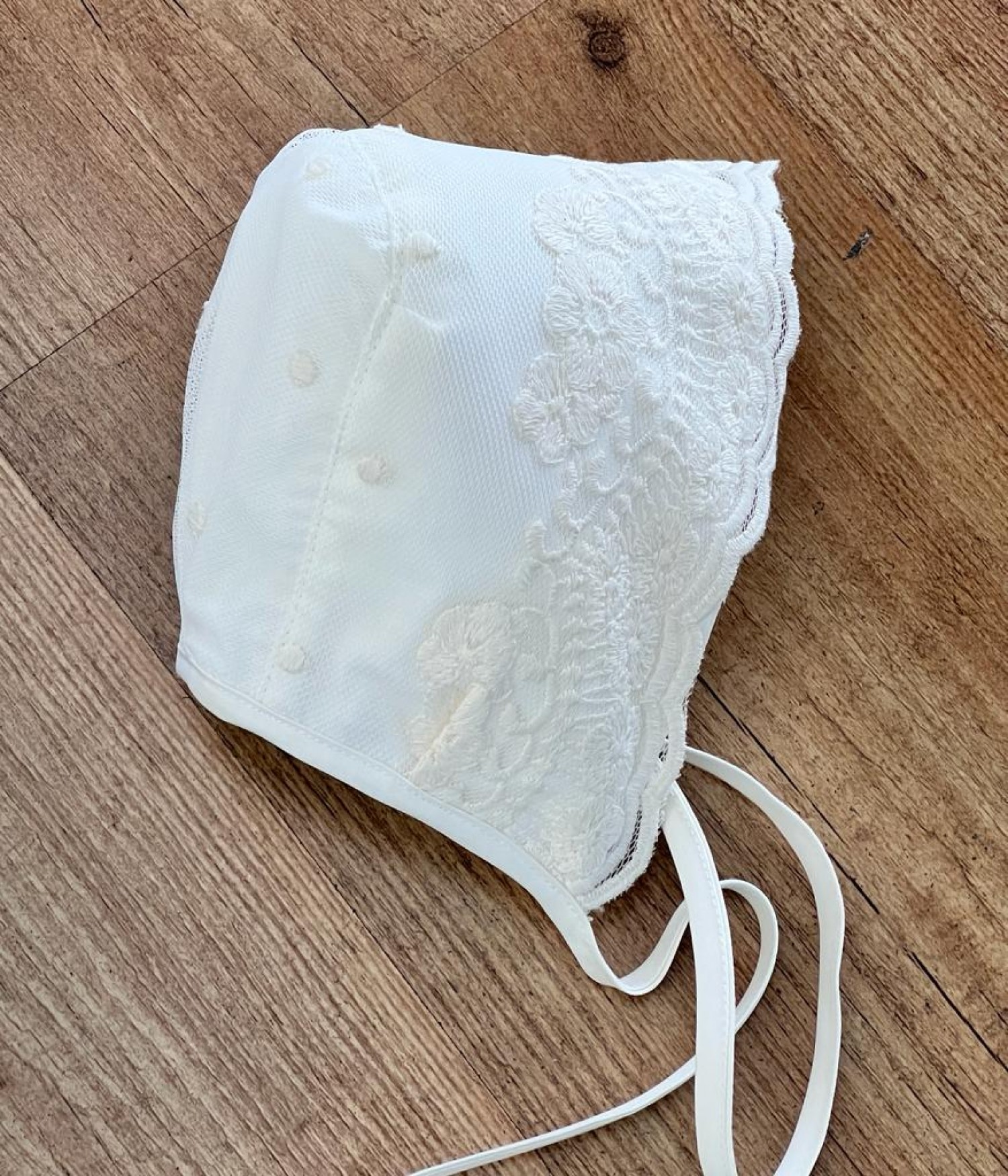 Romper and bonnet set in embroidered tulle with linen bow.