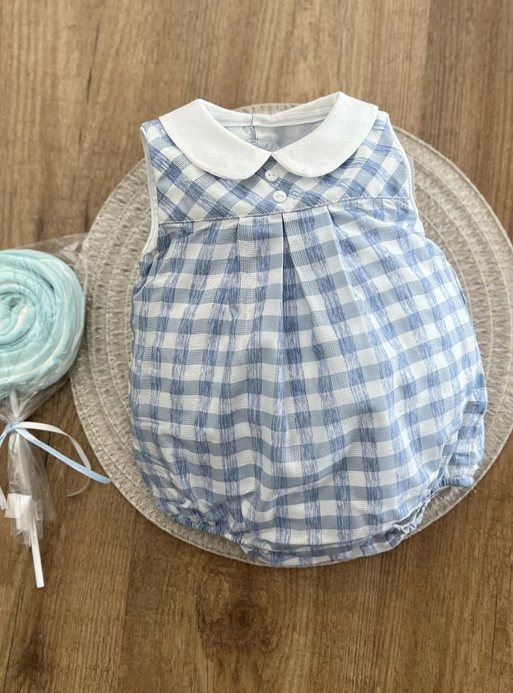 Romper made of white and powder blue checkered poplin. She wears ecru linen baby collars. Simple and classic at the same time elegant.