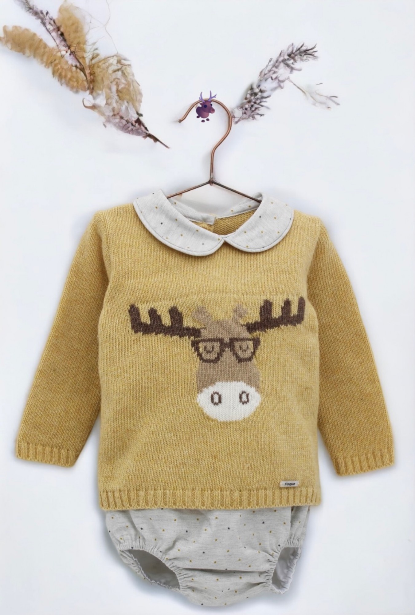 Knitted sweater in caramel yellow with a pretty reindeer. She wears viella baby collars with gray and yellow stars to match the panties.